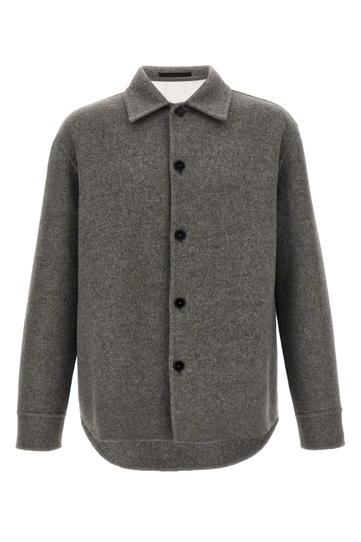 cod. J23BN0006J40020034 Heavy virgin wool overshirt, unlined, front button closure, long cuffed sleeves, pockets. Color: Gray Size & Fit: Boxy fit Composition: 100% virgin wool Made in: Italy