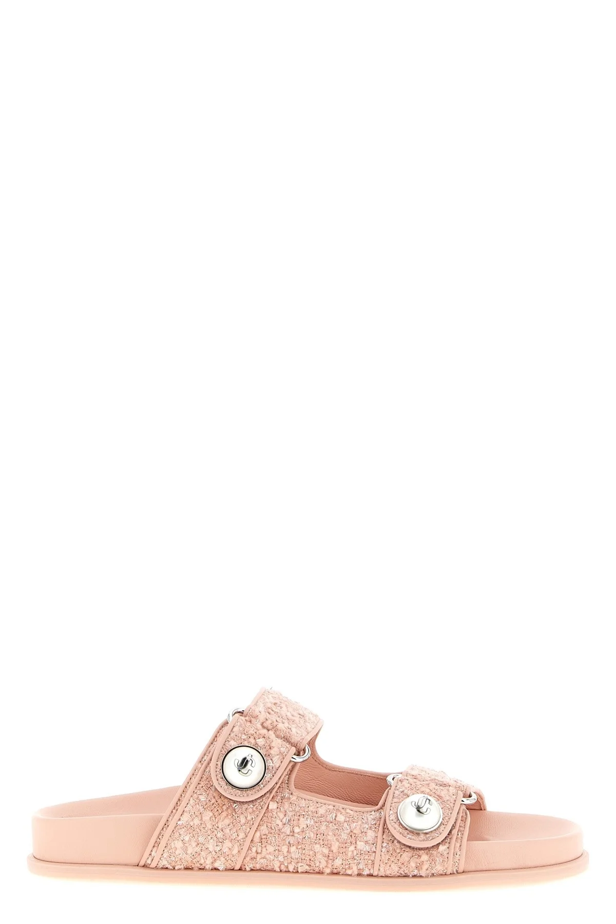 cod. FAYENCESANDALTWWROSEROSE 'Fayence' tweed sandals with metal specks, adjustable straps embellished with logo pearl button, leather insole, rubber sole. Color: Pink Size & Fit: EU WOMEN Composition: 80% tx 5% lh 5% sa 5% pt 5% me Made in: Spain