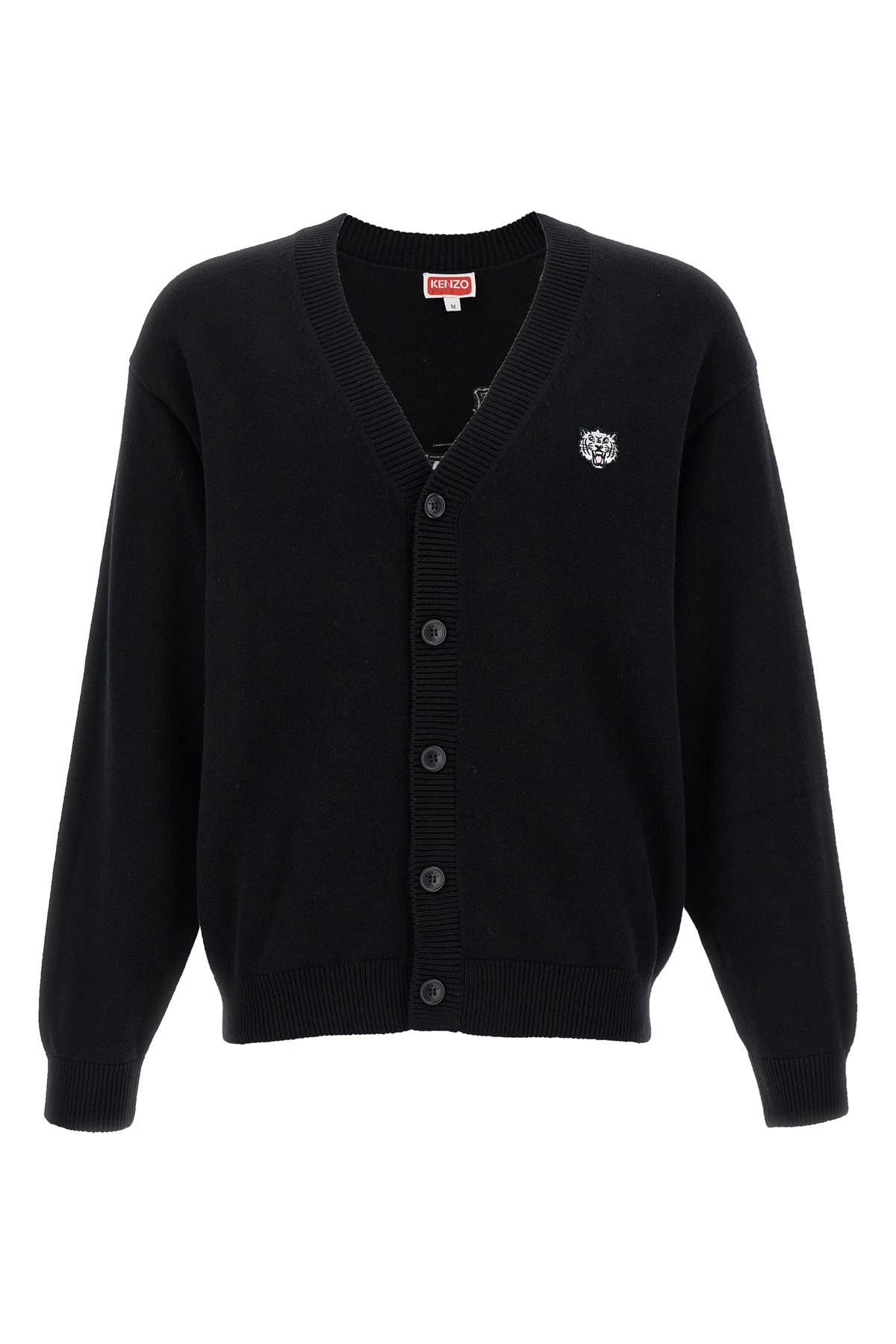 cod. FF65CA7503LI99J Merino wool and cotton blend cardigan, 'KENZO Happy Tiger' embroidery at the front and back, V-neck, front button closure, long cuffed sleeves and dropped shoulders. Color: Black Size & Fit: Comfort fit Composition: 55% wool, 45% cotton Made in: China