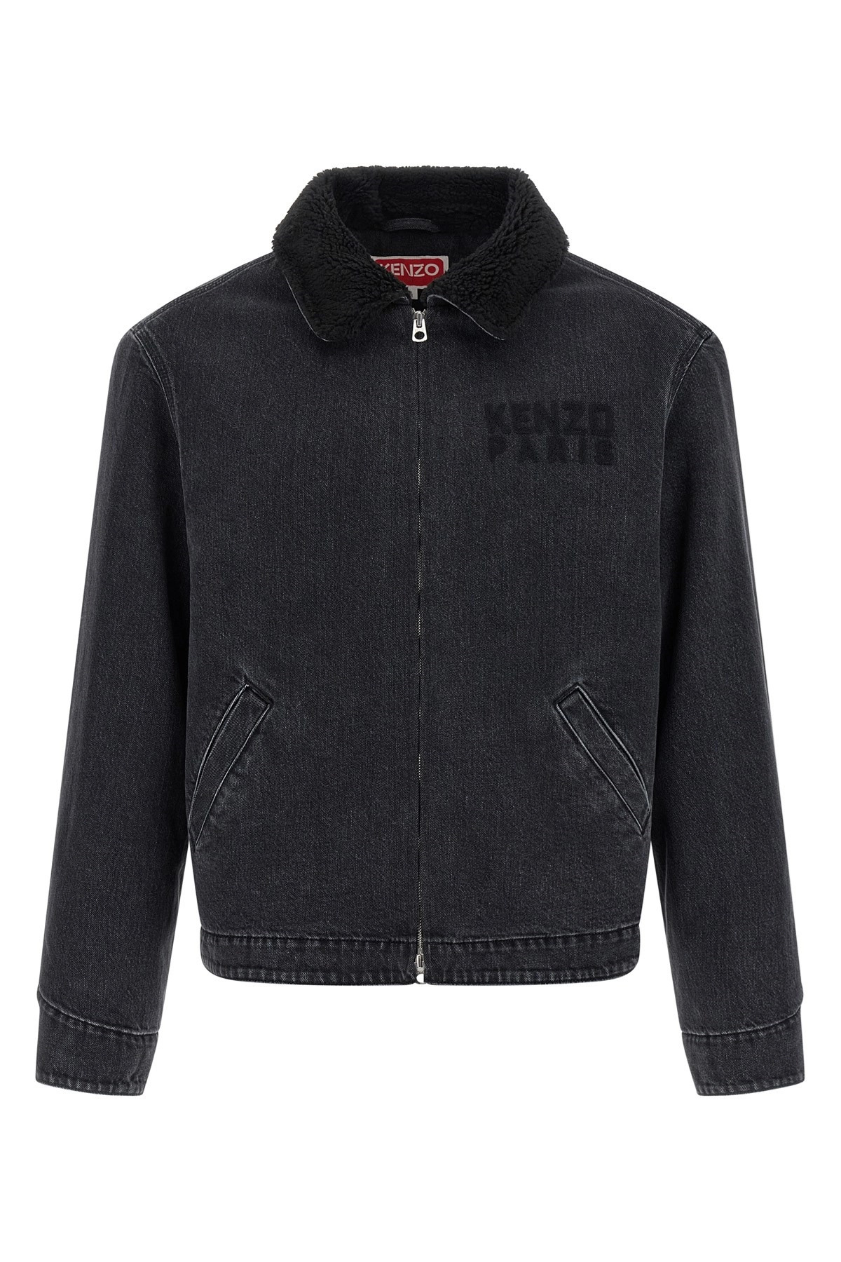cod. FF65DB1056C4BT Japanese stone bleach wash denim jacket, teddy-effect fabric lining and collar, back 'KENZO Happy Tiger' embroidery, front zip closure, pockets, long cuffed sleeves. Color: Black Size & Fit: true to size fit Composition: 99% cotton, 1% elastane Made in: Tunisia