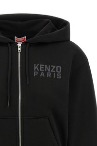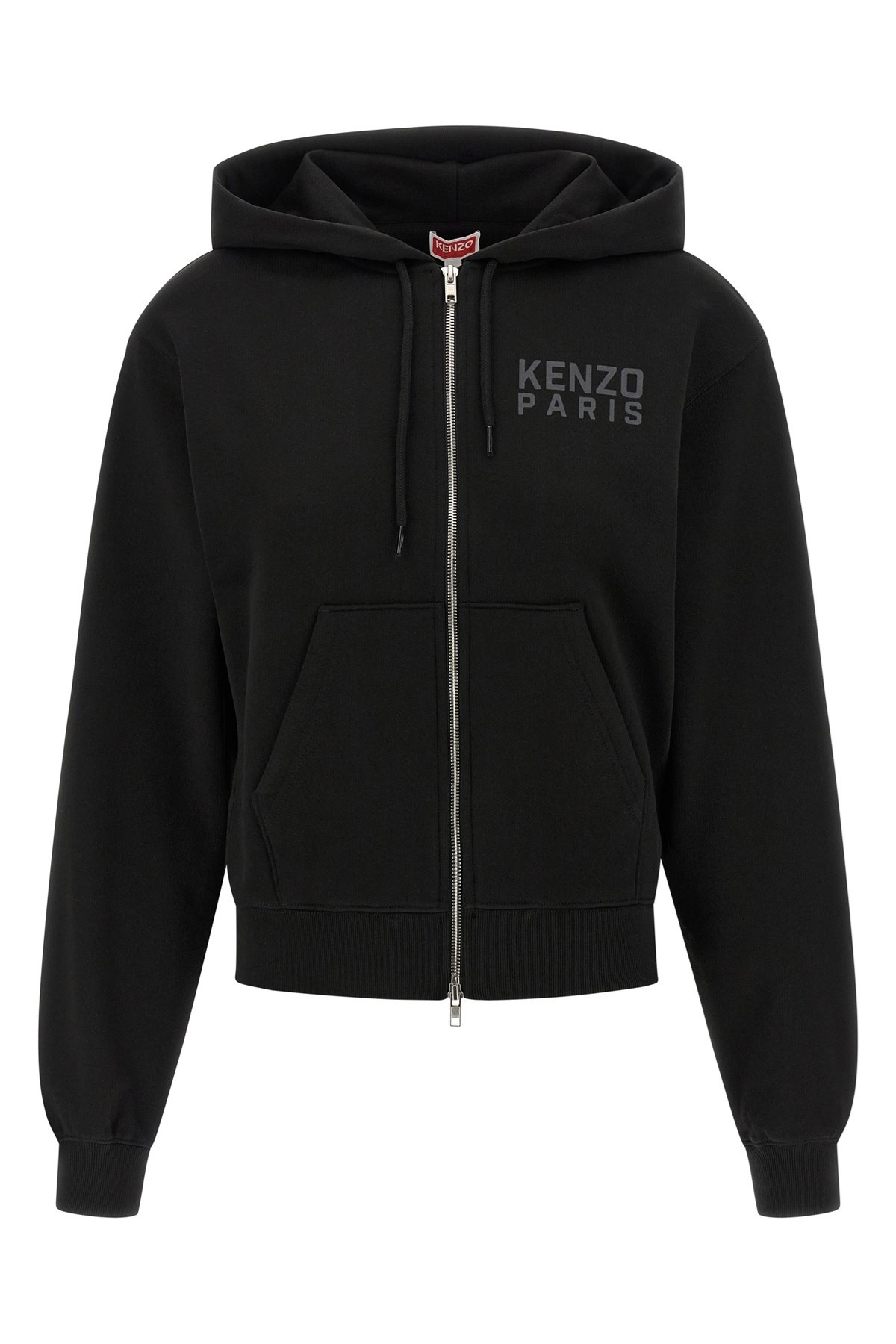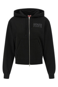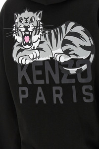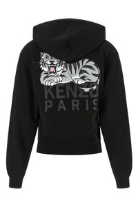 cod. FF62HO2504MF99J Lightly fleece cotton hoodie with 'KENZO Happy Tiger' print on the front and back, front zip closure, pockets, long sleeves with cuffs and dropped shoulders. Color: Black Size & Fit: true to size fit Composition: 100% cotton Made in: Portugal