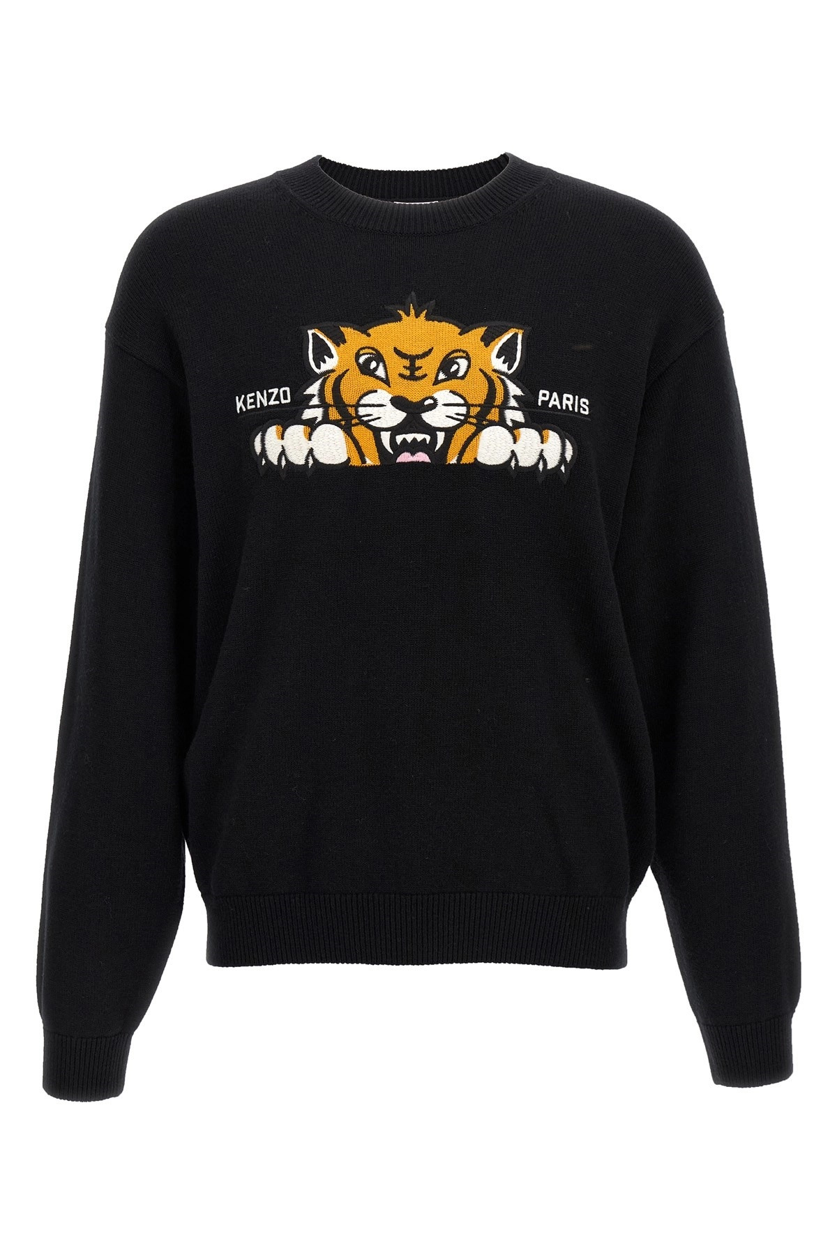 cod. FF65PU7503LI99J Merino wool and cotton blend sweater with front 'KENZO Happy Tiger' embroidery, crew neck, long sleeves with cuffs and dropped shoulders, back embroidery. Color: Black Size & Fit: true to size fit Composition: 55% wool, 45% cotton Made in: China