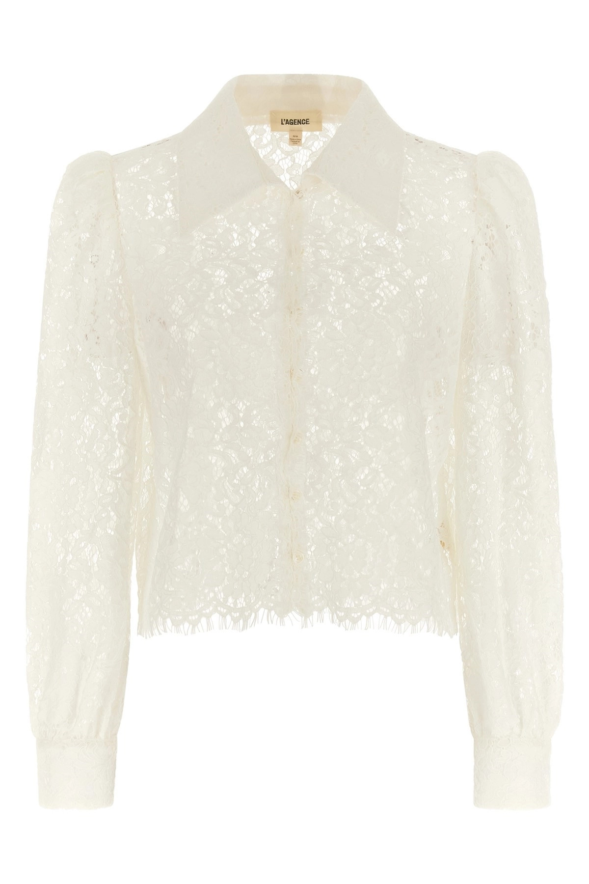 cod. 40750ACKIVOR 'Anita' floral lace shirt, unlined, crop style, front button closure, 3/4 sleeves with puff cuffs and shoulders, asymmetrical hem. Color: White Size & Fit: true to size fit Composition: 75% nylon, 25% cotton Made in: China