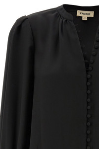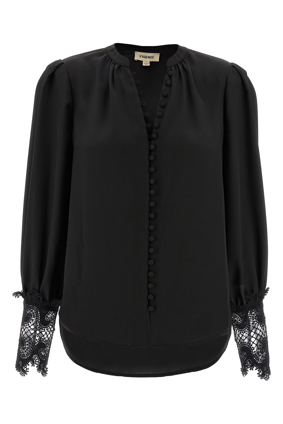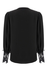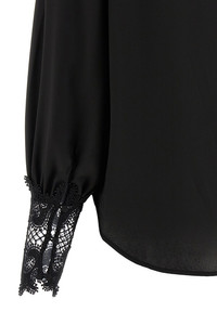 cod. 40411PYTBLAC 'Ava' cady shirt, high neck, front button closure, long sleeves with elongated ruffled guipure lace cuffs and a slightly puff shoulder. Color: Black Size & Fit: true to size fit Composition: 100% polyester Made in: China