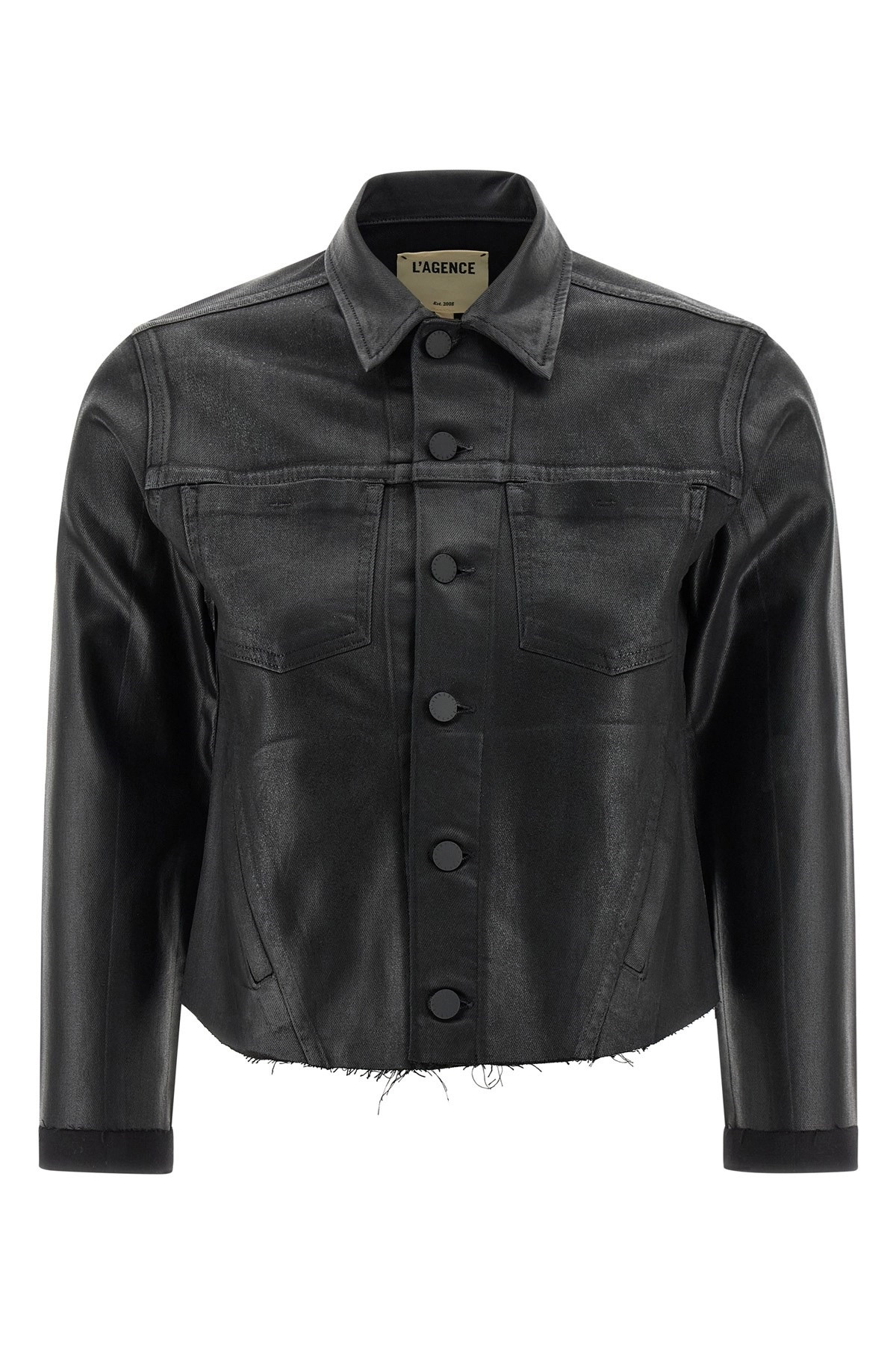 cod. 1431CSNCSABC 'Janelle' thin and subtly shiny cotton denim jacket, crop style with hourglass silhouette, shirt collar, front button closure, pockets, 3/4 sleeves with turn-up on the cuffs, raw cut hem. Color: Black Size & Fit: Slim fit Composition: 88% co, 11% ea 1% sp Made in: United States