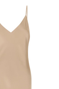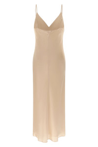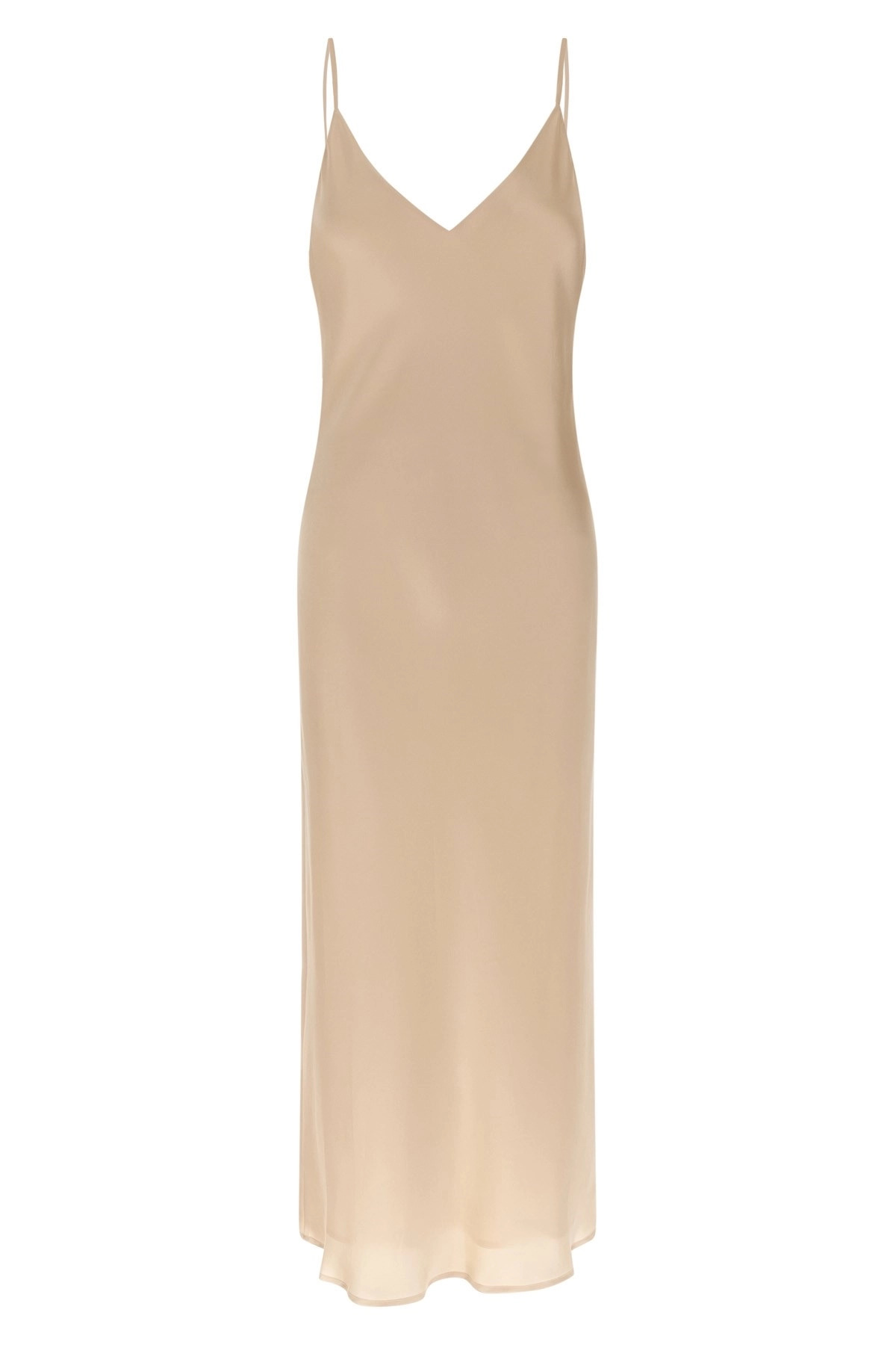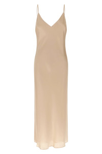 cod. 61253CLWCHMP Seridie' silk charmeuse midi dress with slip with flared silhouette, adjustable straps, sleeveless, wide front V-neck and square back. Color: Beige Size & Fit: true to size fit Composition: 100% silk Made in: China