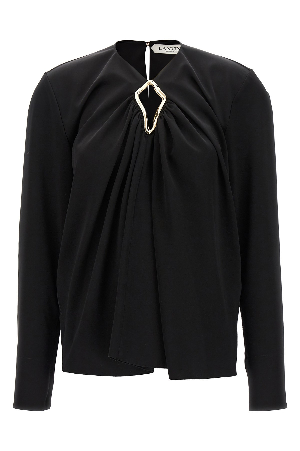 cod. RWTO00045822H2310 Satin blouse, neckline with metal detail, long sleeves, cuffs with buttons. Color: Black Size & Fit: true to size fit French size Composition: 63% triacetate 37% polyester Made in: Spain