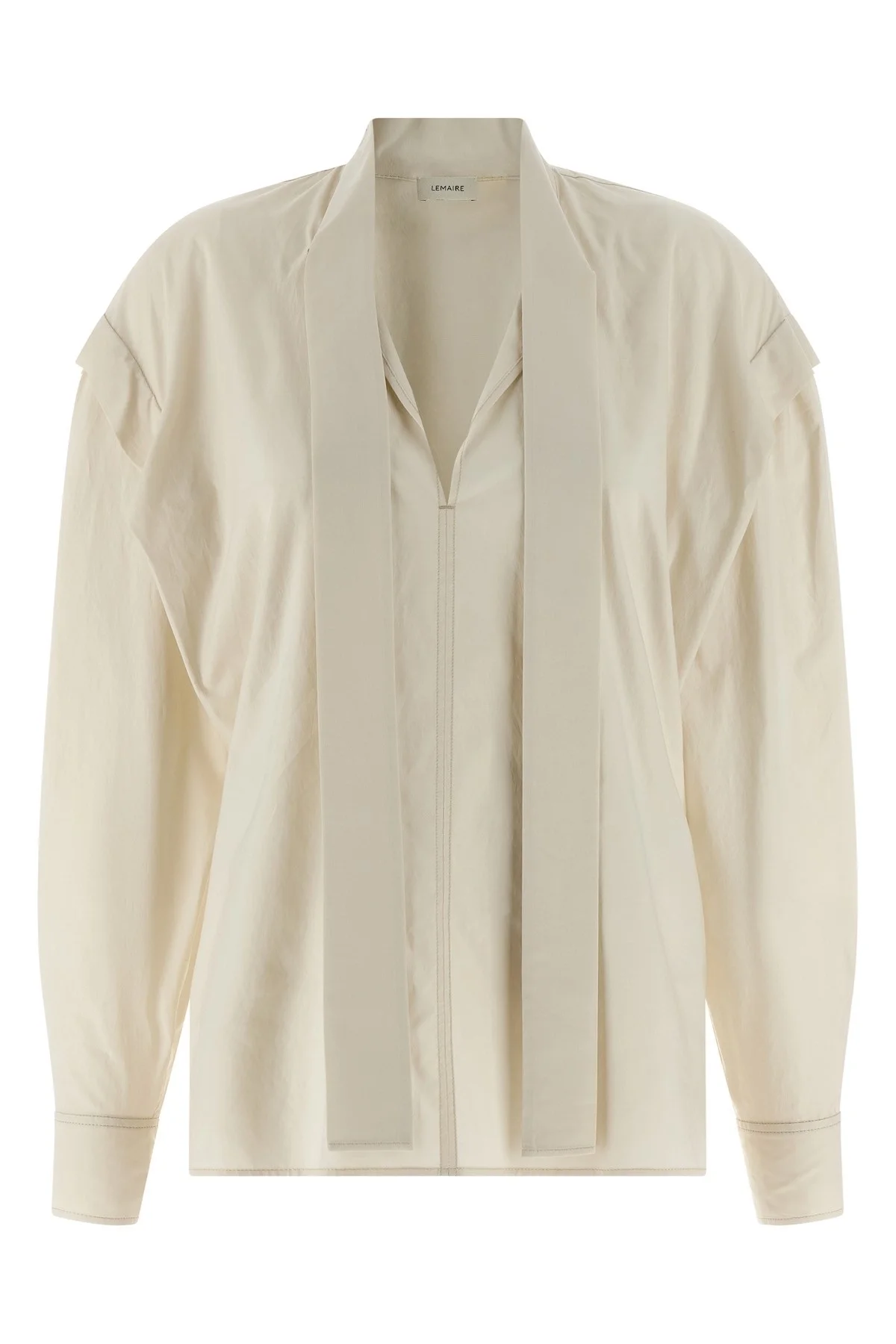 cod. TO1470LF1500WH048 'Ascot' blouse in cotton and silk blend washed with a light patina and a soft hand, Ascott collar, long sleeves with descended curled shoulder and cuffs, side slits. Color: Beige Size & Fit: true to size fit Composition: 80% cotton, 20% silk Made in: Portugal