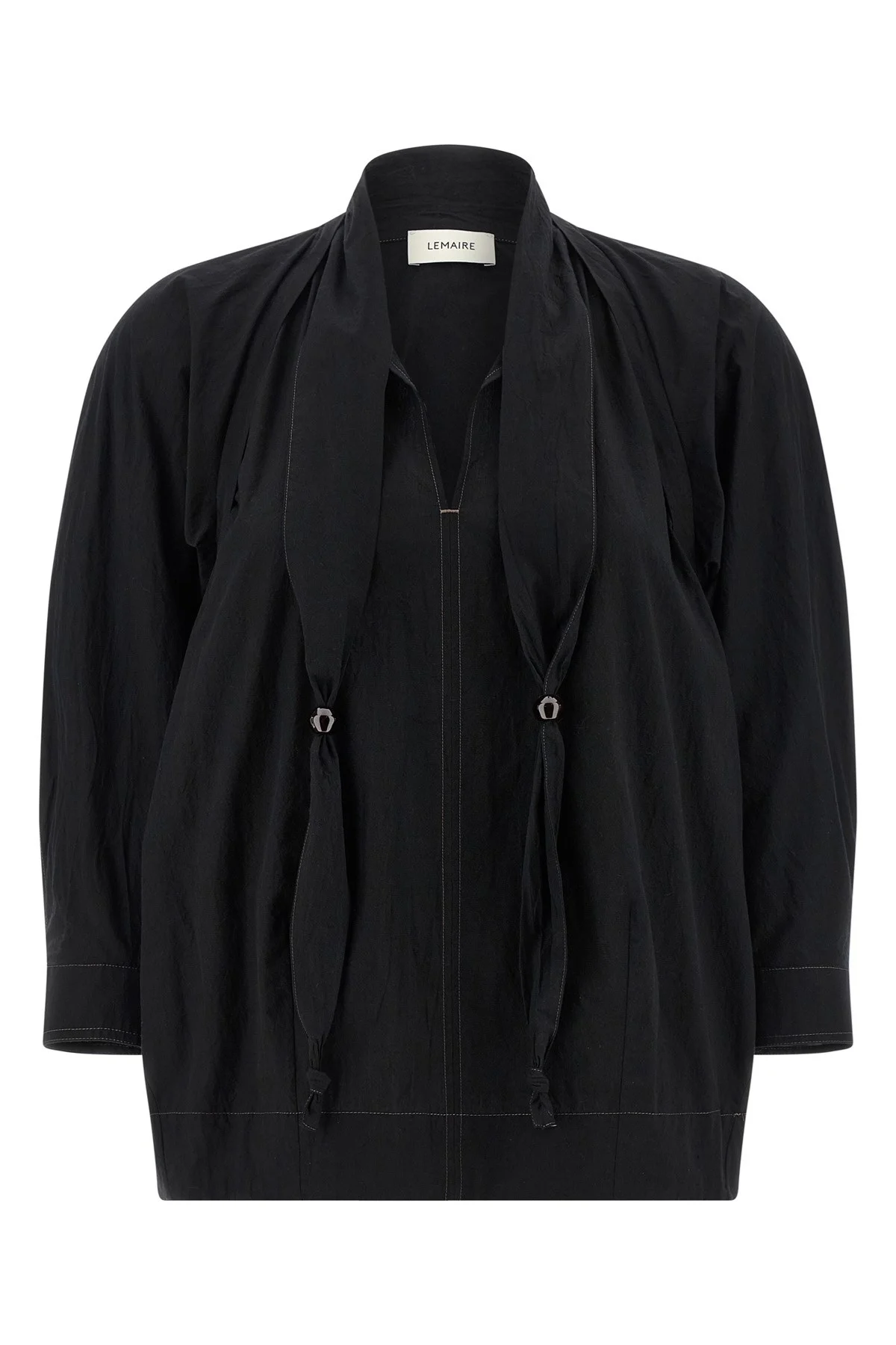 cod. SH1222LF1399BK999 Cotton blouse, V-neck with knotted scarf with resin beaded decorations, 3/4 raglan sleeves with cuffs and buttons, contrast stitching. Color: Black Size & Fit: Boxy fit. Composition: 100% cotton Made in: Portugal