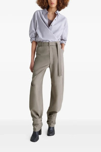 cod. PA1223LF414BR446 Curved Tailored' straight pants in wool, belt loops at the waist with adjustable belt with buckle, zip, hook and button closure, pockets, adjustable tape with button on the cuffs. Color: Gray Size & Fit: True to size fit Composition: 55% polyester, 45% wool Made in: Portugal
