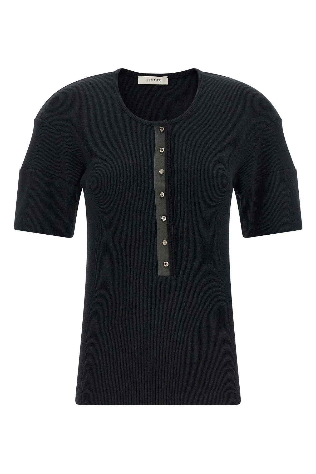 cod. TS0005LJ1030BK999 'Henley' ribbed cotton and linen jersey sweater, round neckline with mother-of-pearl button closure and contrast fabric on the front buttoning, short sleeves with 3D effect pleats. Color: Black Size & Fit: true to size fit Composition: 69% co, 29% li, 2% ea Made in: Portugal