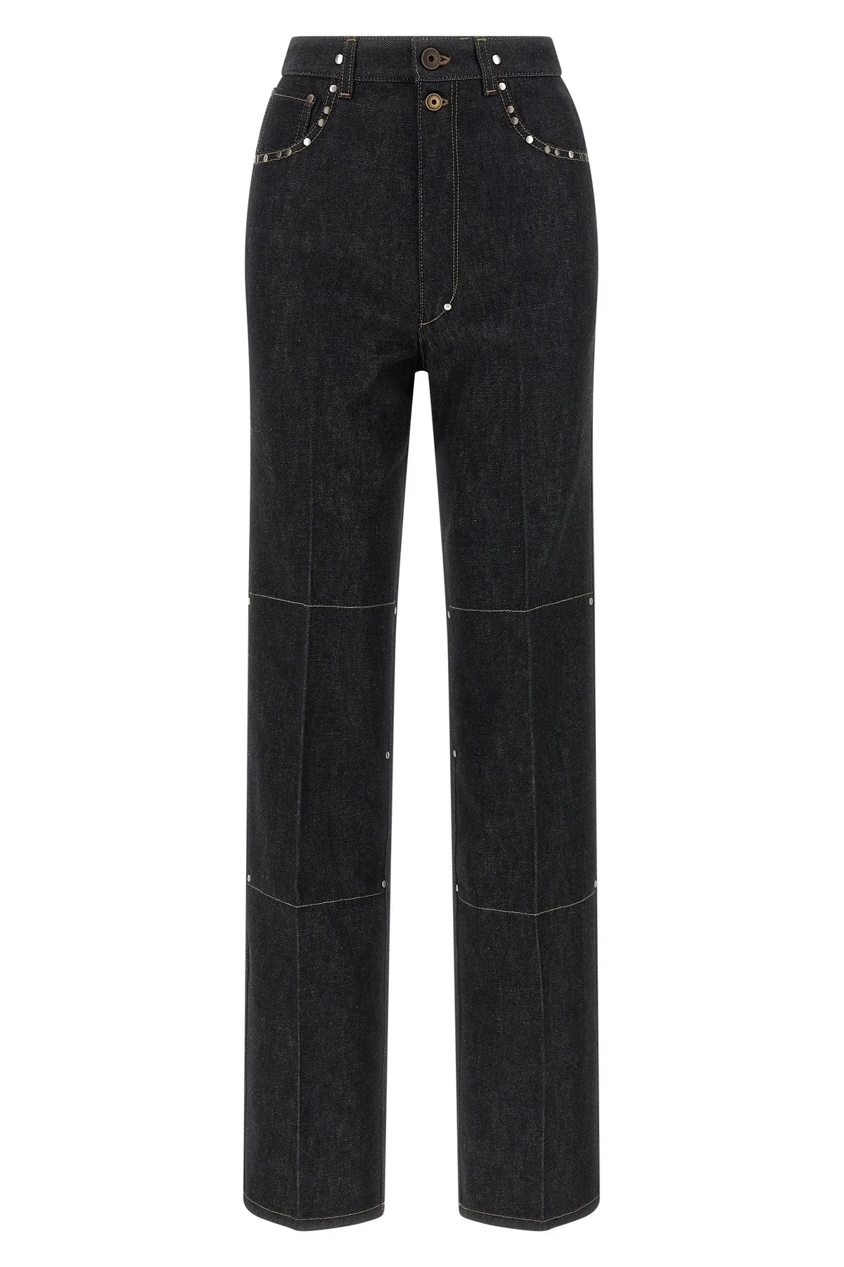 cod. PA1303LD1061BK965 Heavy denim jeans with metal rivets of different sizes, contrast stitching, high waist, straight leg, stretched pleat, front zip and button closure, five pockets, leather logo label with embossed logo at the back. Color: Black Size & Fit: True to size fit - LEMAIRE size Composition: 100% cotton Made in: Italy