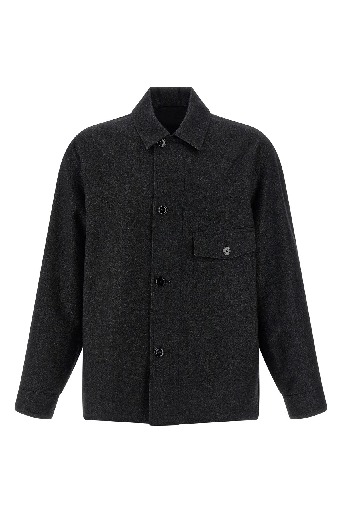 cod. OV1022LF1319MU200 Wool and cotton overshirt, breast pocket, front button closure, long cuffed sleeves. Color: Black Size & Fit: oversized fit Composition: 82% virgin wool, 18% cotton Made in: Hungary