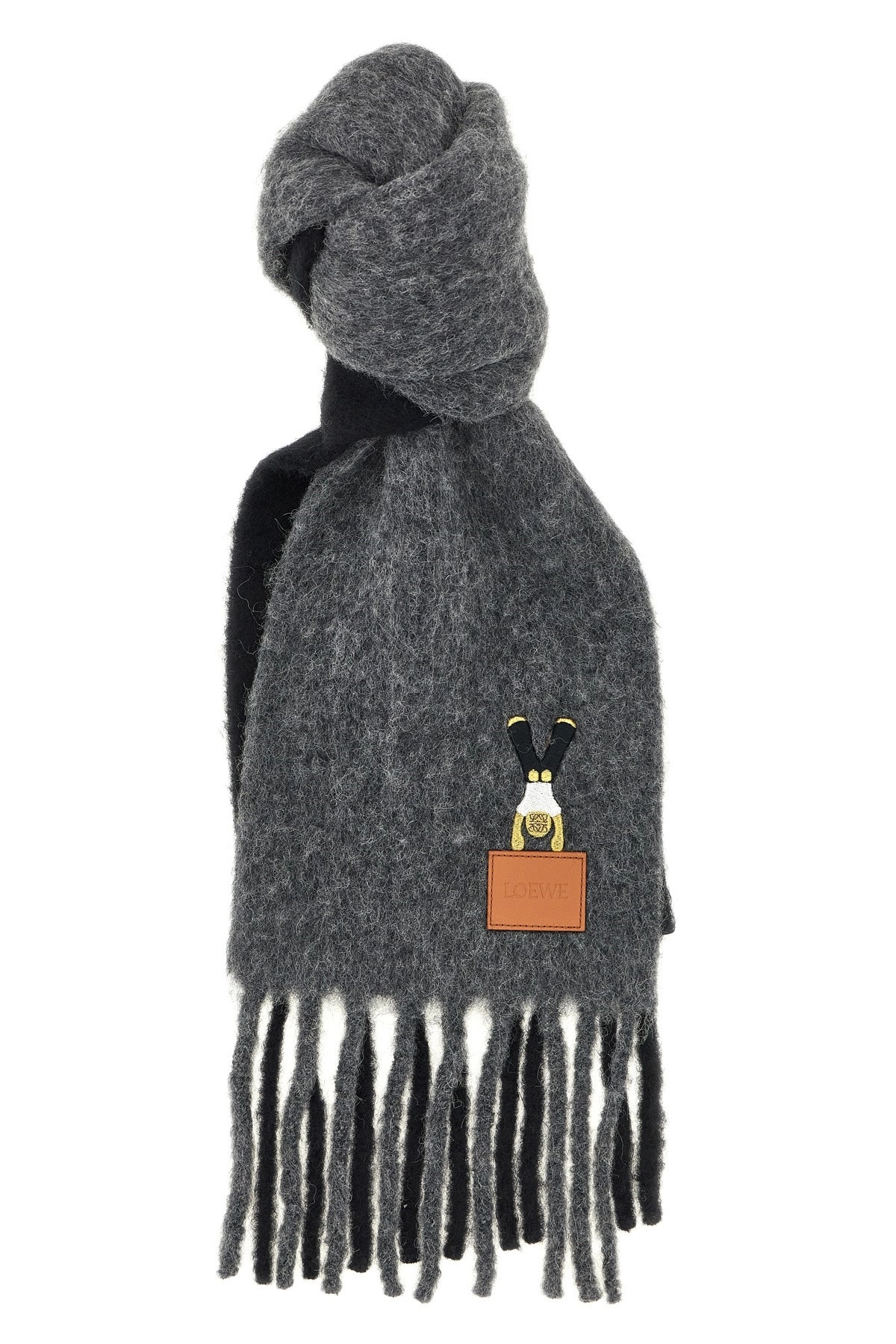 cod. FSF4SS1W031156 Medium-weight wool and alpaca blend double-sided scarf, lame thread 'Acrobat' embroidery with leather patch with embossed LOEWE logo, fringed edges. Color: Multicolor Size & Fit: 23 x 176 cm Composition: 60% wp, 25% wo, 15% pa Made in: Italy