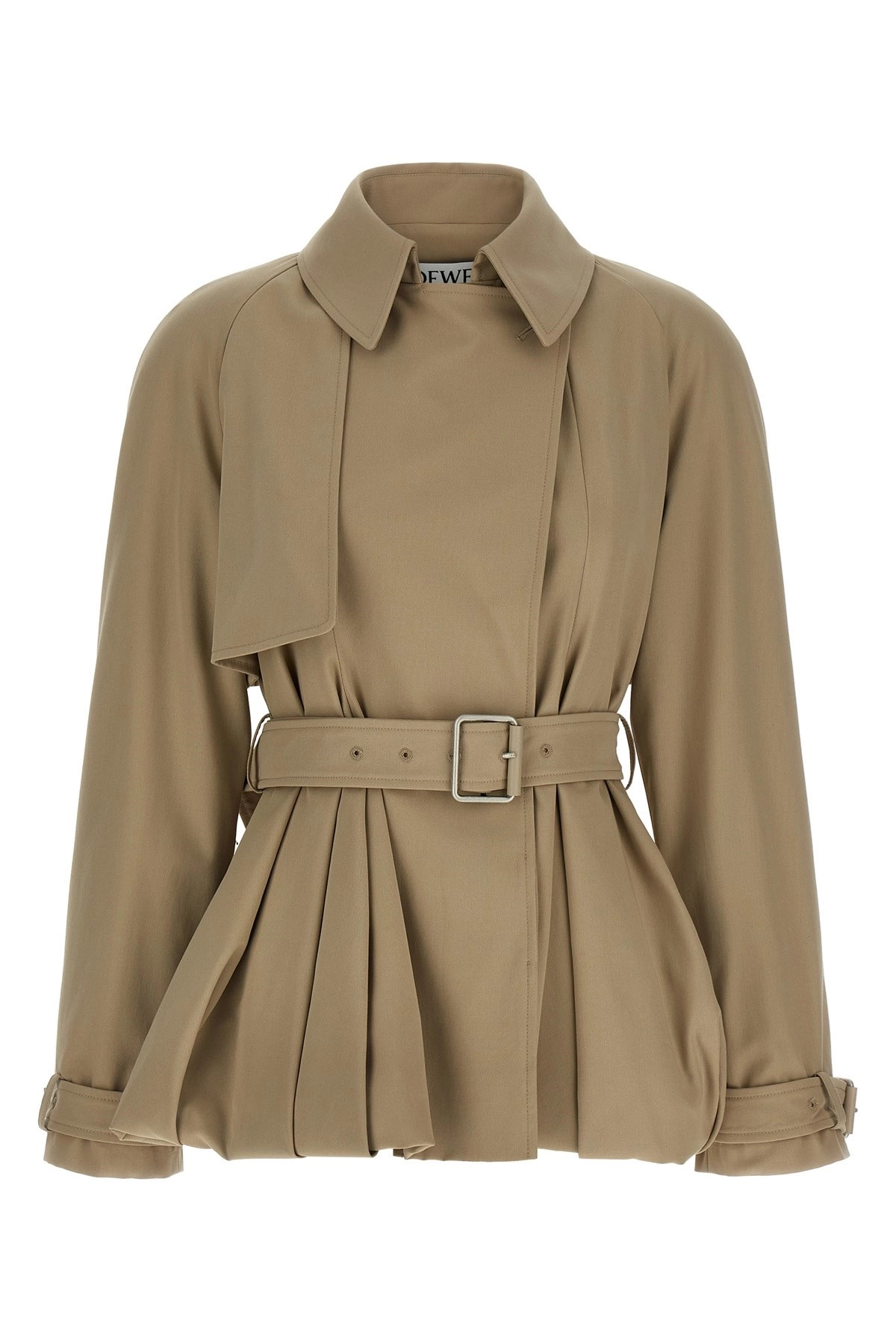 cod. S540Y02XCE2140 Light cotton gabardine trench coat with balloon silhouette, tone-on-tone leather patch with embossed Anagram LOEWE pattern and back cape, lapel collar, front button closure, pockets, long sleeves, drawstring at the hem, removable belt. Color: Beige Size & Fit: comfort fit - FRENCH size Composition: 95% cotton 5% calf leather Made in: Italy