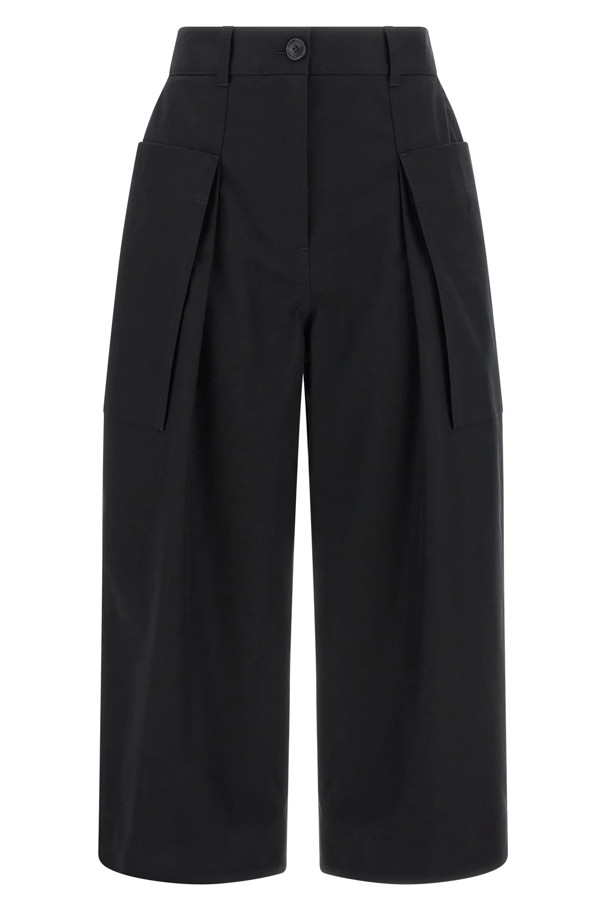 cod. S359Y04XHW1100 Light cotton and silk gabardine trousers with crop cargo style with side pockets, side pins and gussets, medium waist, wide leg, elastic waistband at the back, front zip and button closure, pockets, leather logo tag with embossed logo on the back. Color: Black Size & Fit: true to size fit - FRENCH size Composition: 85% cotton 10% silk 5% lh Made in: Italy