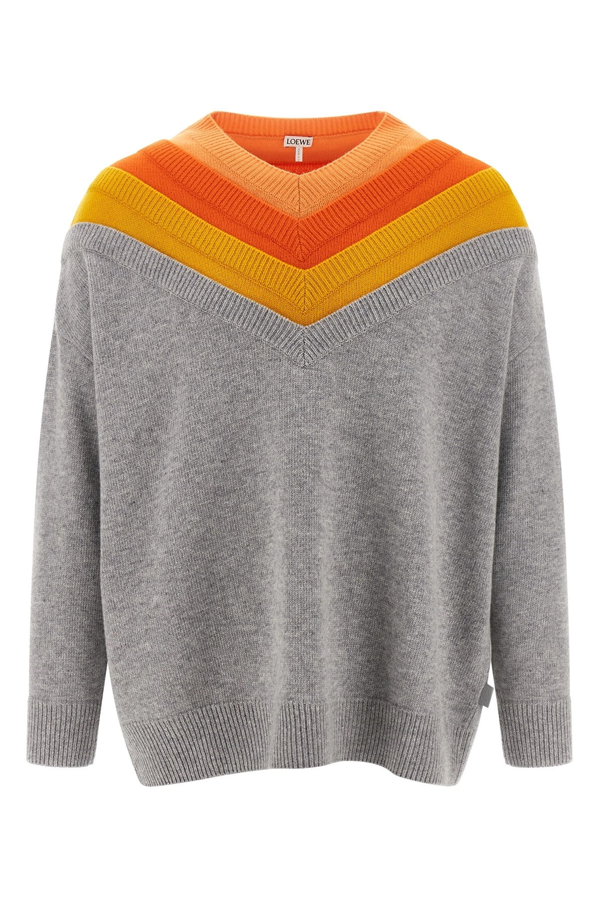 cod. S540Y14KGP0141 Medium weight wool sweater with trompe l'œil layered construction, V-neck, long cuffed sleeves, leather side patch with embossed Anagram pattern. Color: Multicolor Size & Fit: Relaxed fit Composition: 94% wool 4% lh 2% polyamide Made in: Italy