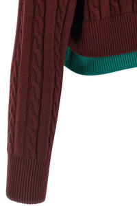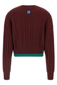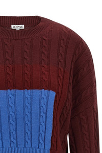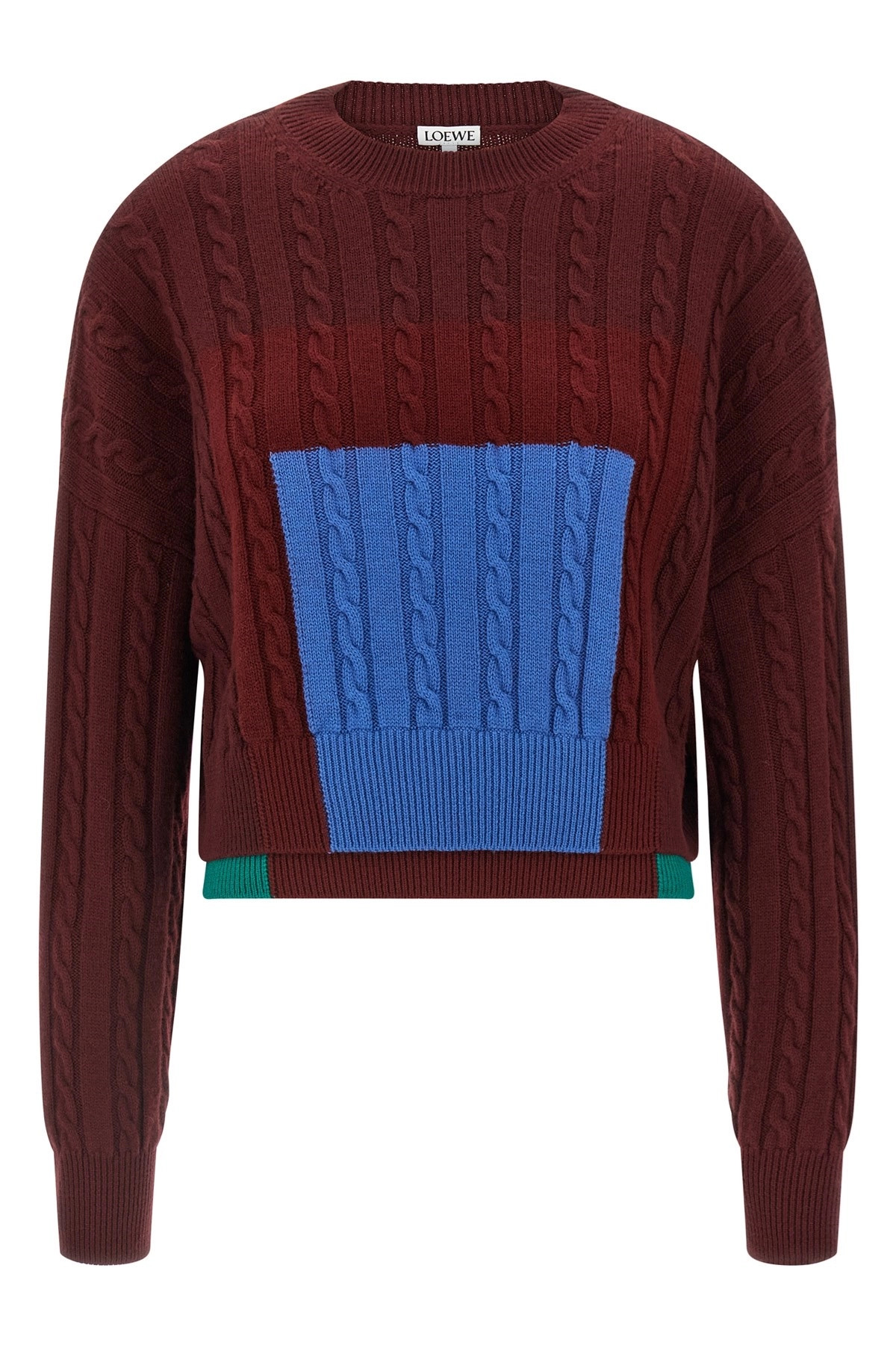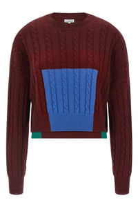 cod. S540Y14KGR6654 Textured wool sweater of medium weight with braided knit and check inlays inspired by the "Homage to the Square" series by Josef Albers, crop model, Anagram rubber patch at the back, crew neck, long sleeves with cuffs and dropped shoulder, double-layer hem. This shirt is part of LOEWE x Josef and Anni Albers collection. Color: Bordeaux Size & Fit: Relaxed fit Composition: 100% wool Made in: Italy