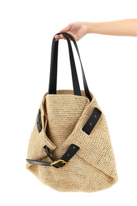 cod. ABESBSMX042123 Medium 'Punch Hole' shopping bag in woven raffia, adjustable leather belt detail with embossed logo and metal buckle, flap closure, double fixed leather handle. Handcrafted product, any imperfections are to be considered characteristics of uniqueness. Color: Beige Size & Fit: W 46 x H 38 x D 15 cm Composition: 75% raffia 25% calf leather Made in: Spain