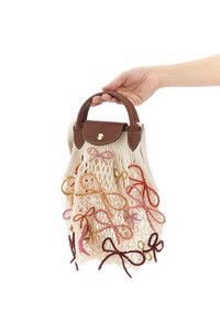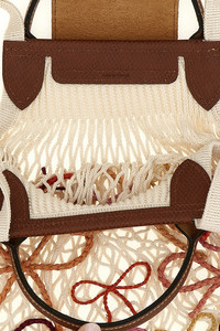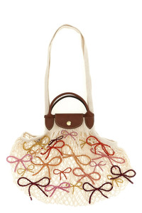 cod. 10121HJB037 'L Le Pliage Filet' shoulder bag in cotton mesh canvas with multicolor raffia bows on the front, Russian leather flap with snap button closure and embossed logo, double short leather and long cotton handles. Bag handmade by the NGO ANAKA in Madagascar. Color: Multicolor Size & Fit: W 38 (bag base) x H 31 cm Composition: 100% cotton
