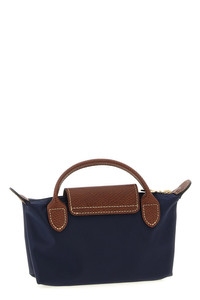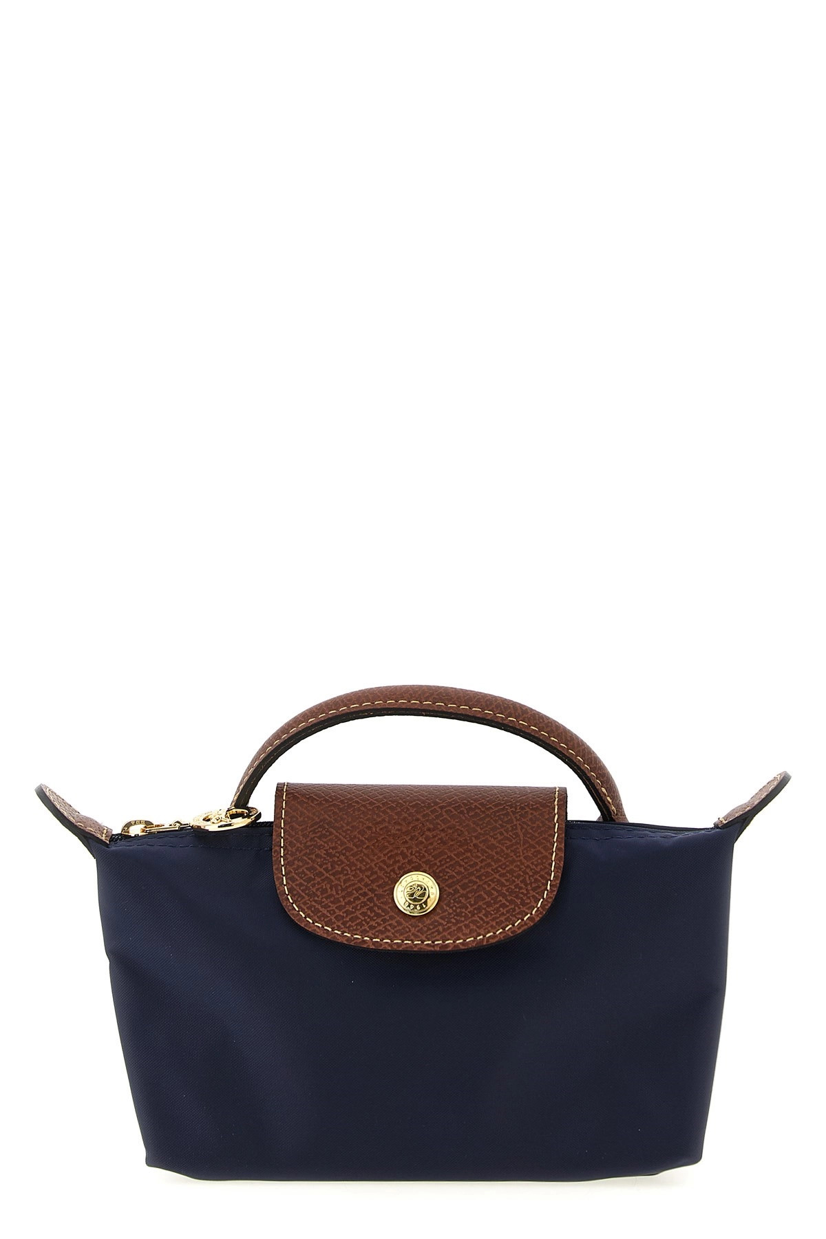 cod. 34175089P68 'Le Pliage Original' foldable nylon canvas clutch bag, top zip closure, fixed leather handle, leather flap with snap button closure and embossed logo. SUSTAINABLE: Product made with recycled polyamide. Color: Blue Size & Fit: W 17 x H 11 x D 5.5 cm Composition: 100% polyamide Made in: France
