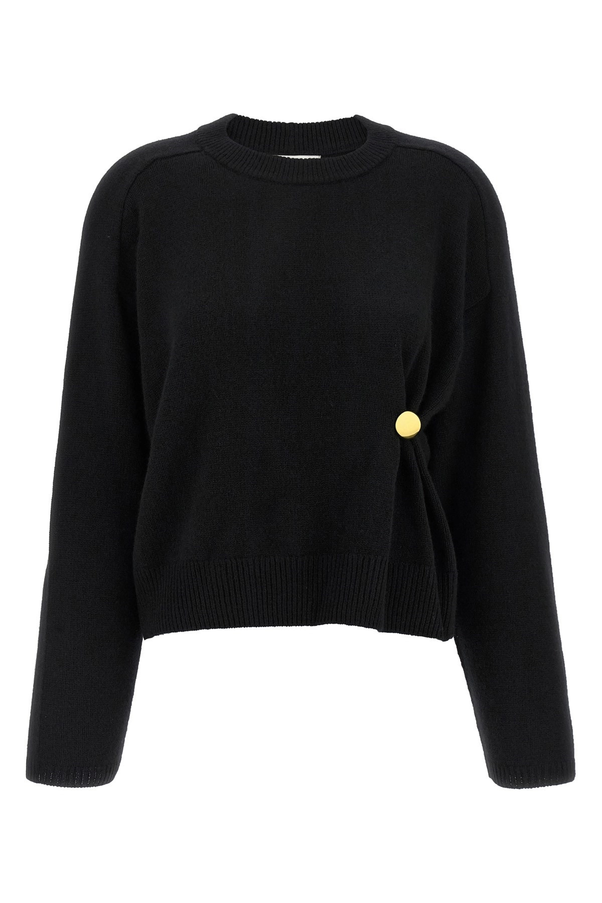 cod. BILLBLACK 'Bill' cashmere sweater with draping with front metal pin, crew neck, long sleeves with dropped shoulders. Color: Black Size & Fit: true to size fit Composition: 100% cashmere Made in: China
