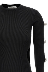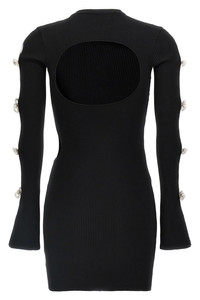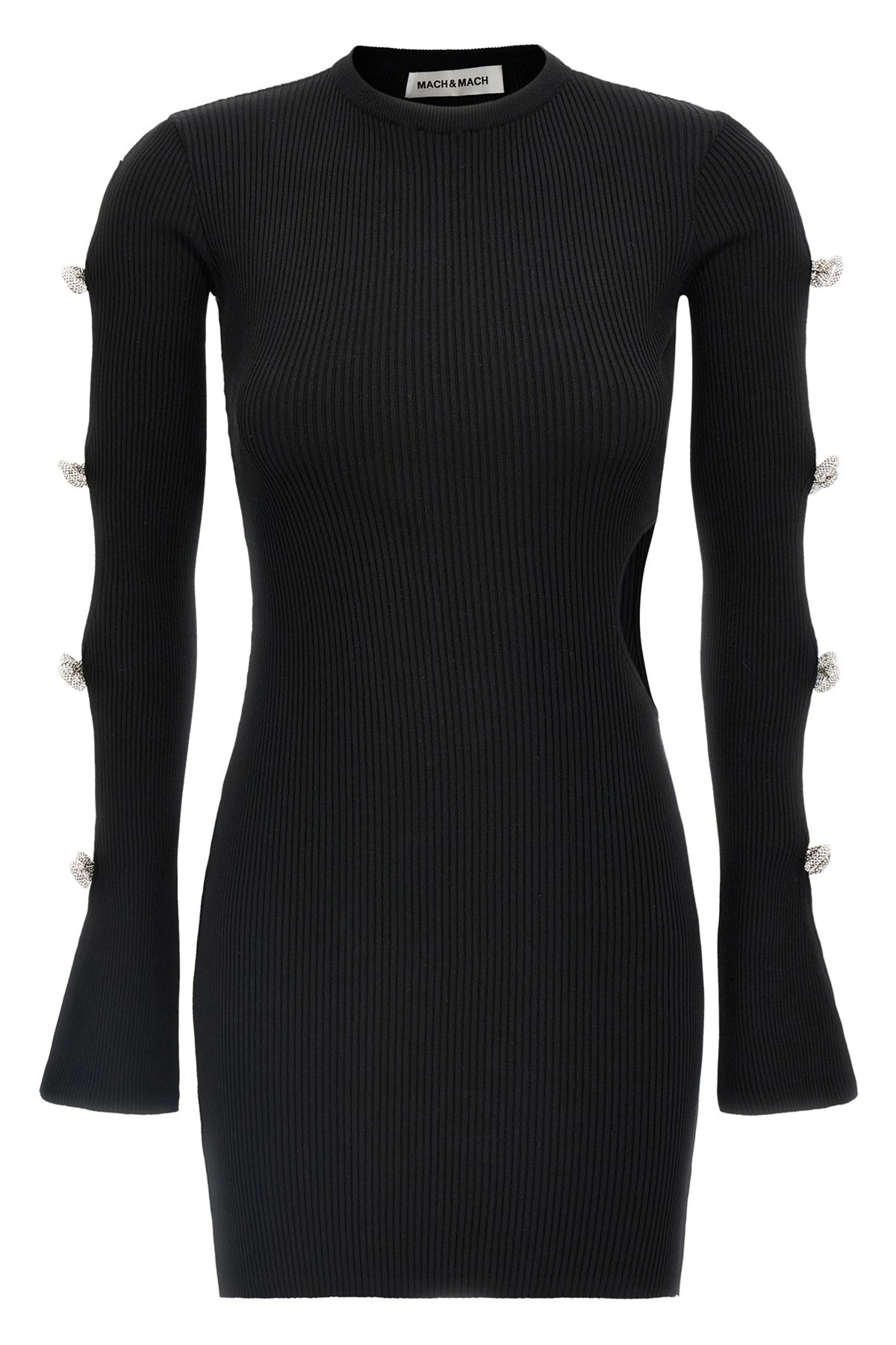 cod. R25KD111KNTBLKBLACK 'Cut-Out Crystal Bow' mini dress in stretch viscose blend with all-over cut-out details, crew neck, long sleeves with rhinestone bow decoration. Color: Black Size & Fit: true to size fit Composition: 70% viscose, 30% polyester Made in: Italy