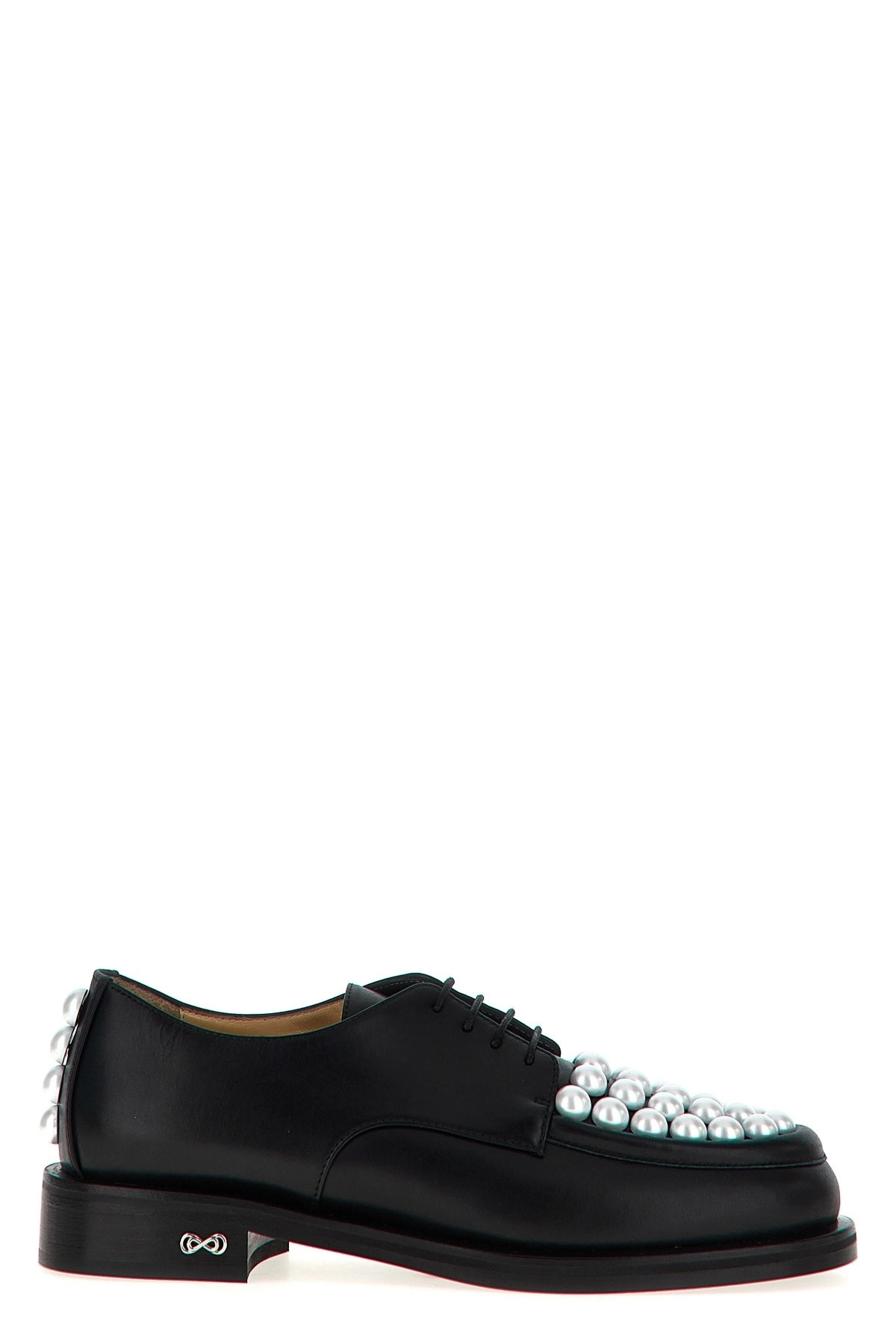 cod. PF24S076530CLFB02 'Sirene' leather lace-up shoes with contrast bead applique, laces and leather sole. Color: White/Black Size & Fit: EU WOMEN Composition: 100% calfskin leather (Bos Taurus) Made in: Italy