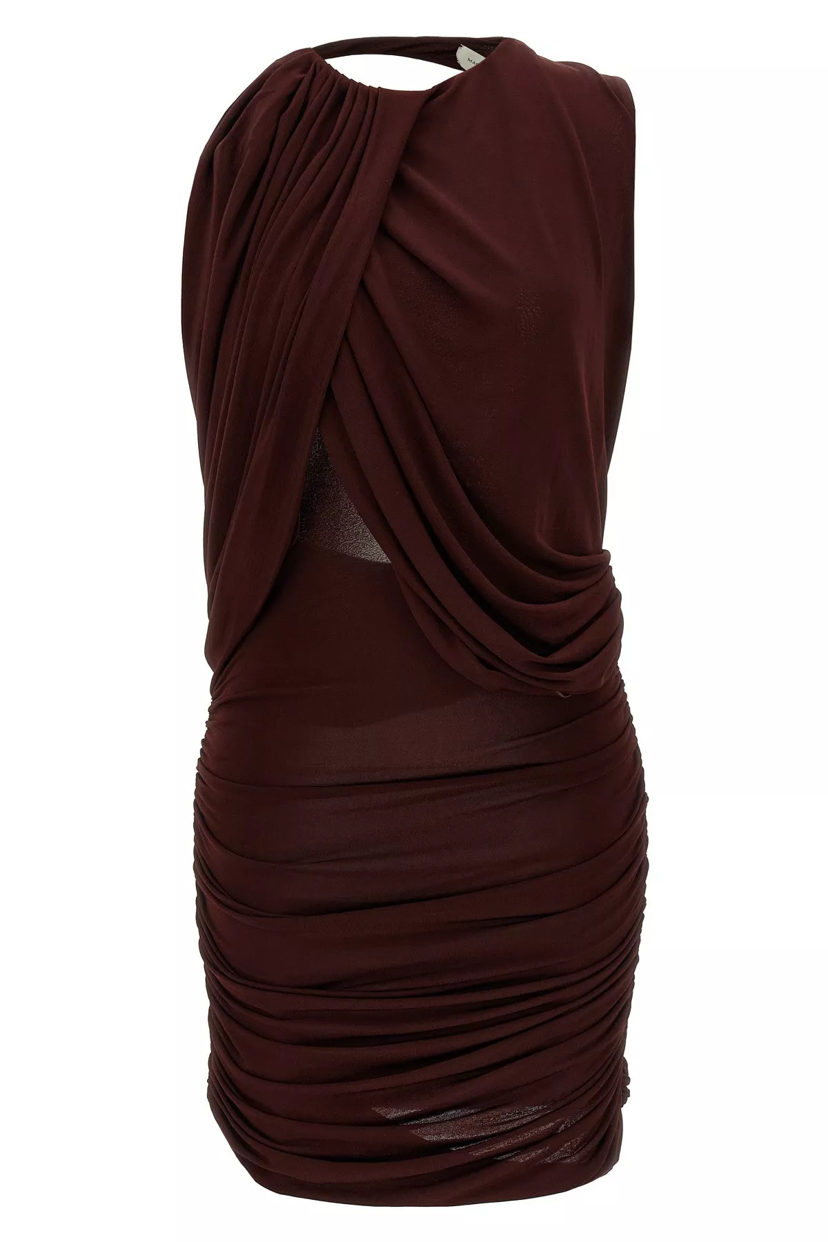cod. 298525BORDEAUX '09' stretch jersey mini dress, ruffled skirt, sleeveless top, round neckline with back button closure, asymmetrical draping on the right shoulder, wide cut out on the back. Color: Bordeaux Size & Fit: true to size fit FRENCH size Composition: 83% viscose 11% polyamide 6% elastane Made in: Poland