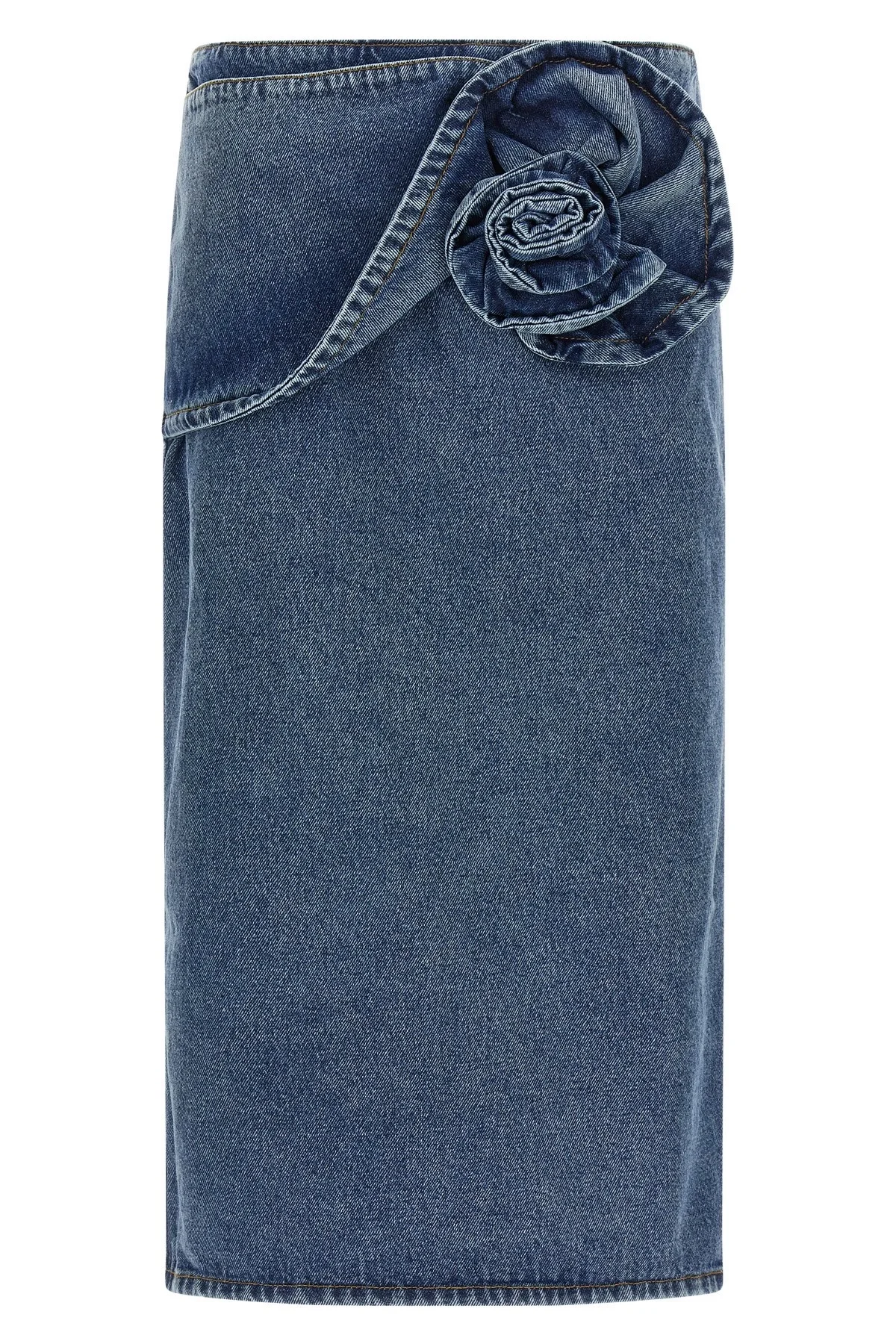 cod. 147426DARKBLUE '11' midi skirt in cotton denim with contrast stitching, large 3D floral decoration on the front, longuette model, zip closure and back split. Color: Blue Size & Fit: true to size fit - FRENCH size Composition: 100% cotton Made in: Poland