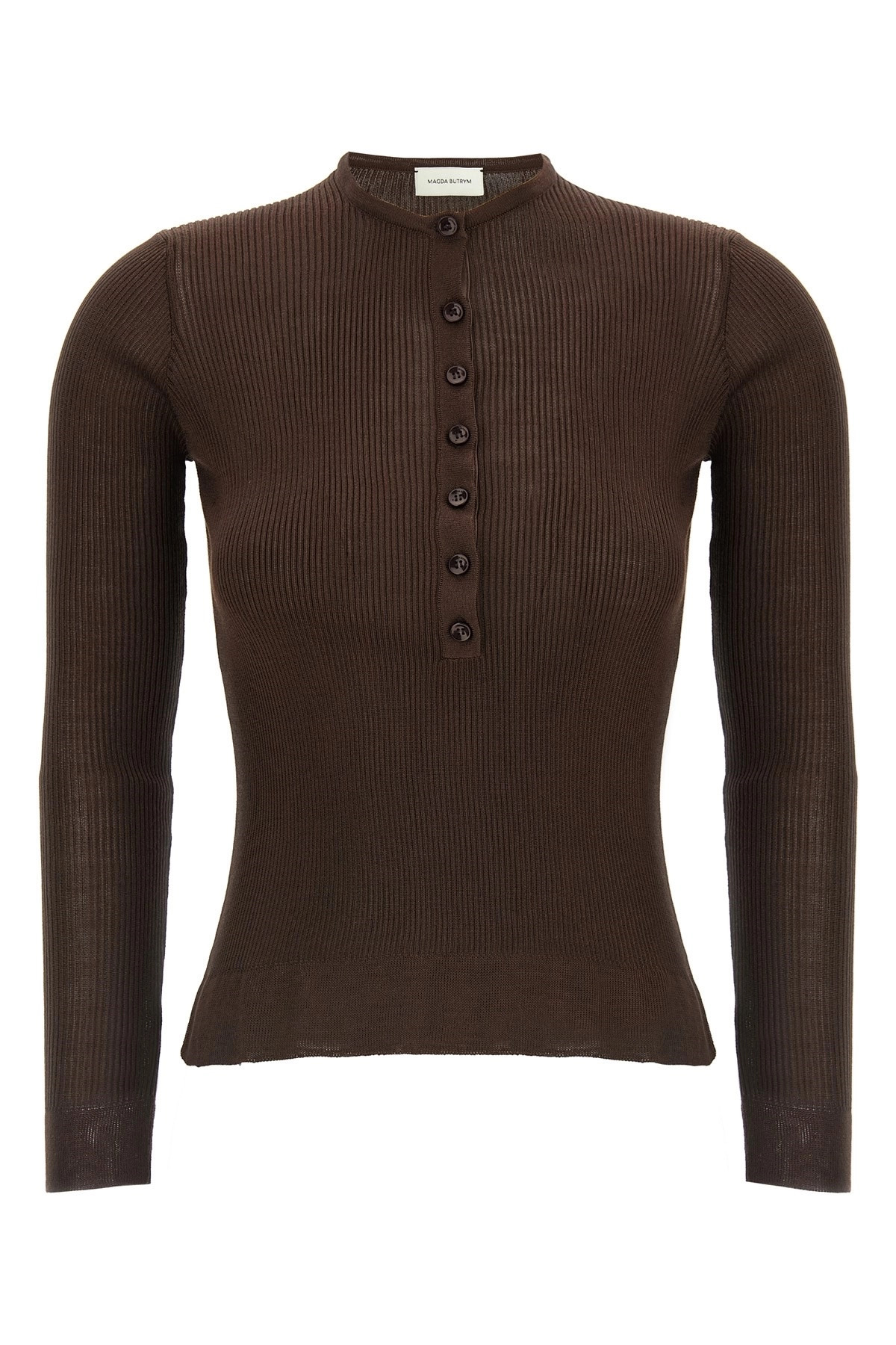 cod. 318725BROWN 20 ribbed silk sweater with seraph style, crew neck with button closure and long sleeves. Color: Brown Size & Fit: True to size fit French sizing Composition: 100% silk Made in: Italy