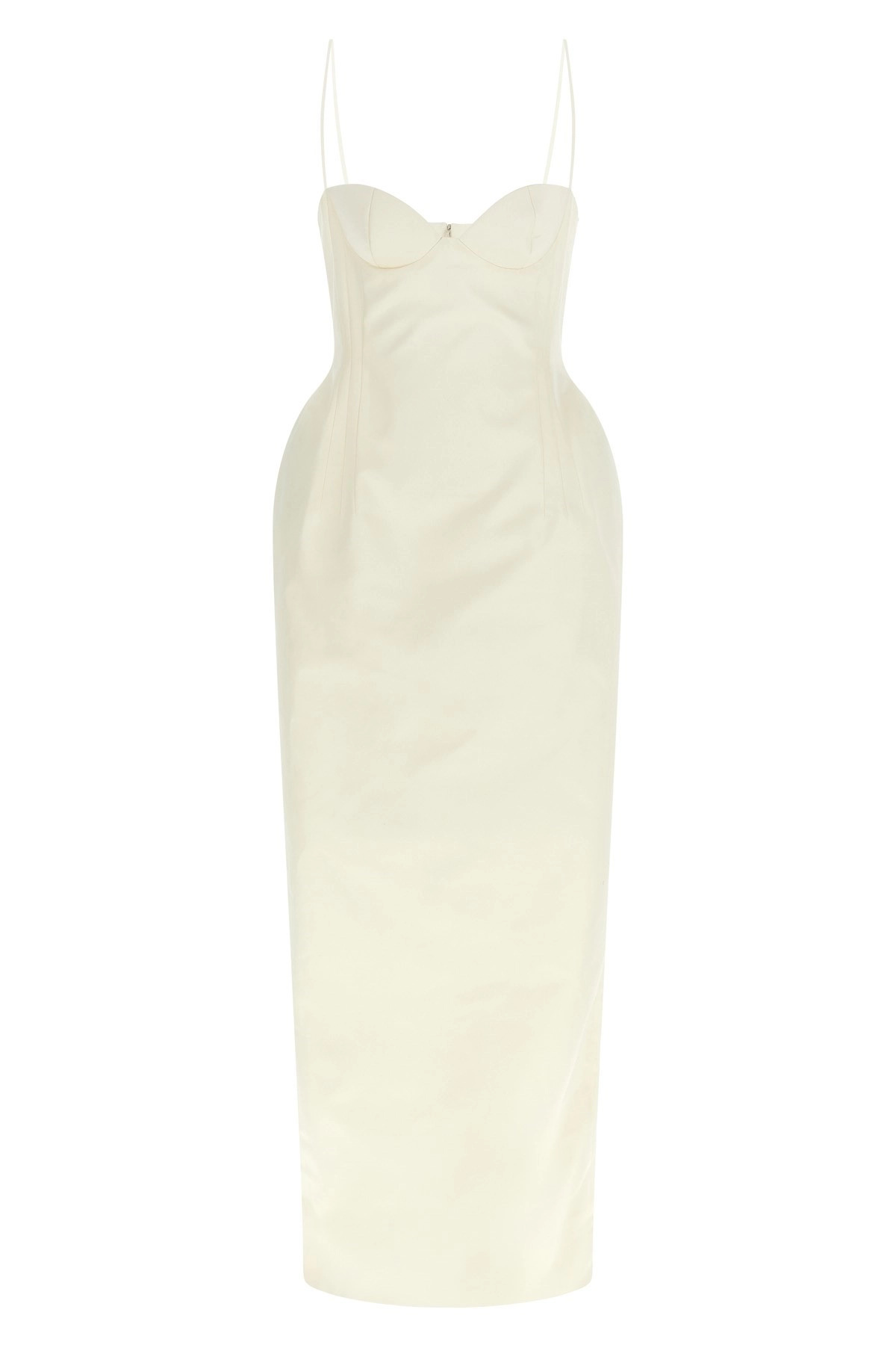 cod. 249725CREAM Long '30' silk dress with hourglass silhouette, sweetheart neckline, bra with tight bodice and padded cups, cushions on the sides, thin straps, sleeveless, wide slit and back zip closure. Color: White Size & Fit: true to size fit - FRENCH size Composition: 100% silk Made in: Poland
