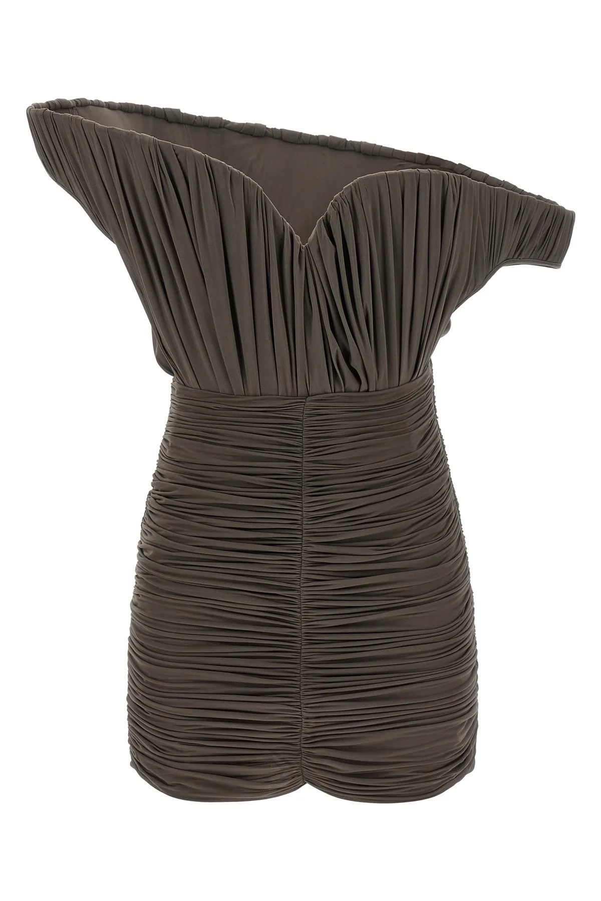cod. 288426BROWN '33' mini dress in draped jersey, sculptural one-shoulder model with rose petal-shaped fan detail, inner bustier with slats and zip and side hooks closure, asymmetrical hem. Color: Brown Size & Fit: true to size fit - FRENCH size Composition: 92% cupro, 8% elastane Made in: Poland