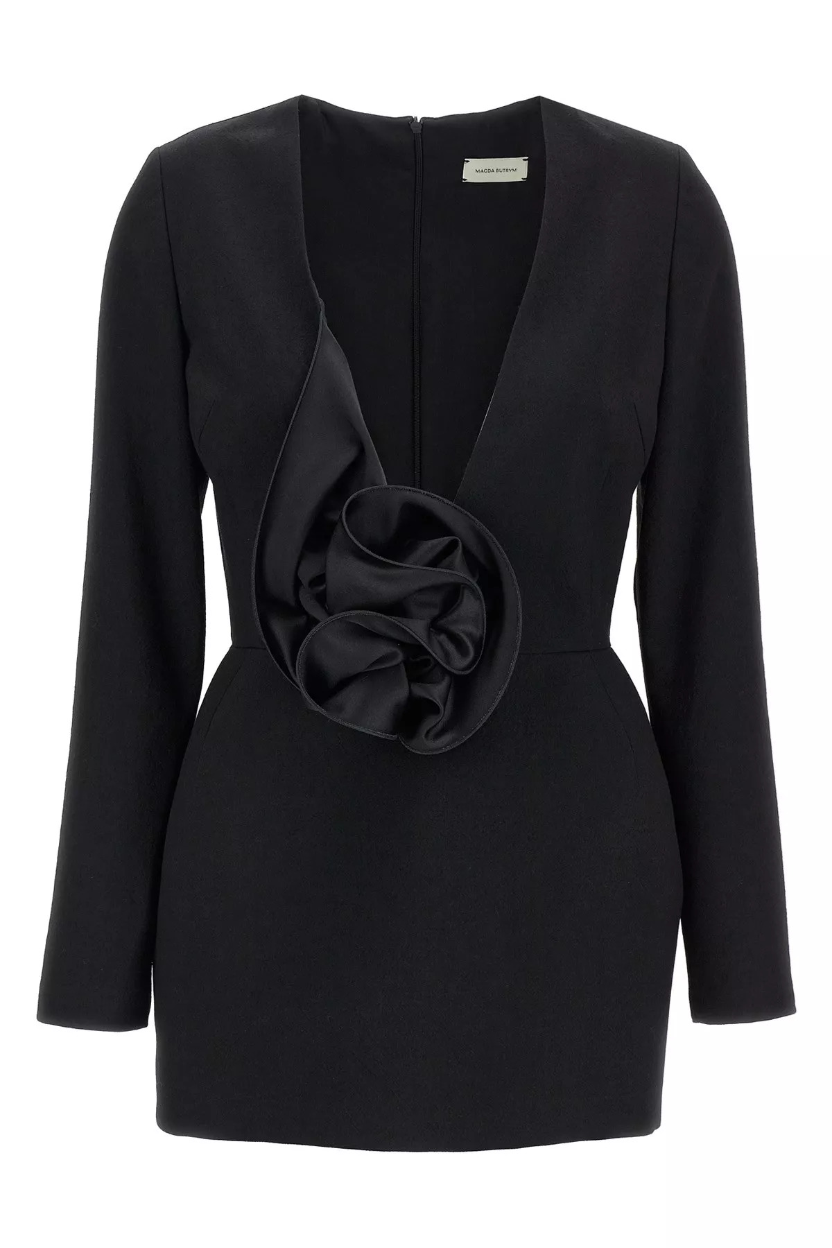 cod. 444525BLACK '37' wool mini dress with silk lining, deep V-neck with 3D floral application at the waist, long sleeves, structured skirt on the sides, back zip closure. Color: Black Size & Fit: true to size fit FRENCH size Composition: 100% wool Made in: Poland