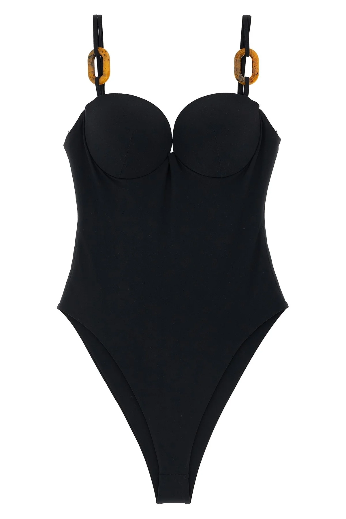 cod. 610426BLACK 'RE26' one-piece swimsuit with padded cups, thin straps and jewelry detail. Color: Black Size & Fit: True to size fit Composition: 75% polyamide, 25% elastane Made in: Poland