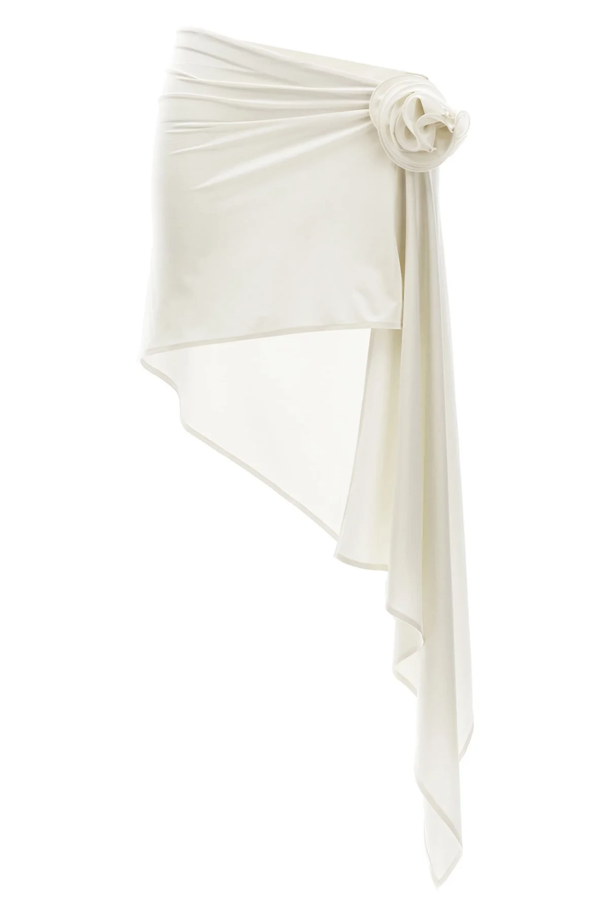 cod. 634425CREAM Draped stretch fabric '01' skirt with side maxi flower applique, asymmetrical pattern with side slit and sash, elastic waistband. Color: White Size & Fit: true to size fit French size Composition: 75% polyamide, 25% elastane Made in: Poland