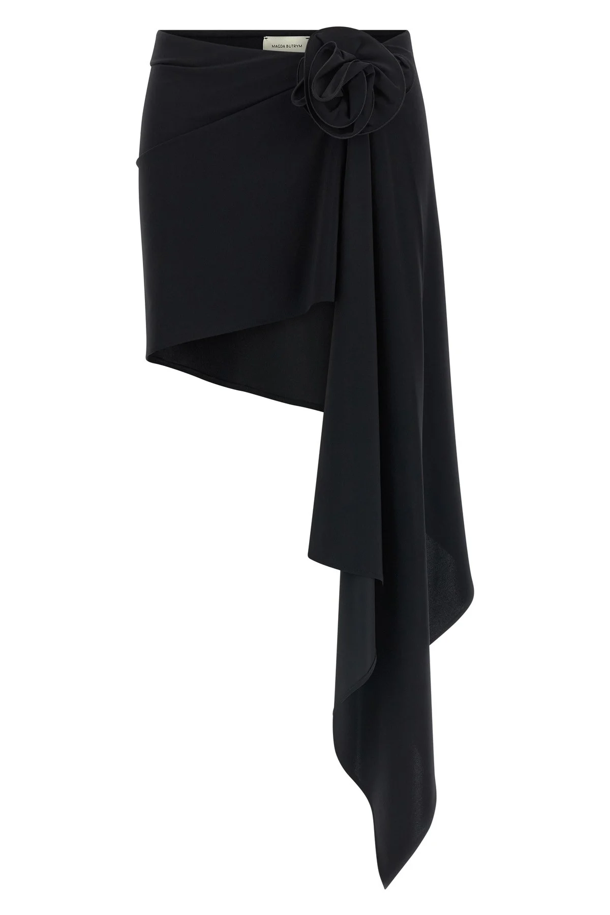 cod. 402723BLACK Draped stretch fabric '01' skirt with side maxi flower applique, asymmetrical pattern with side slit and sash, elastic waistband. Color: Black Size & Fit: true to size fit French size Composition: 72% polyamide, 28% elastane Made in: Poland
