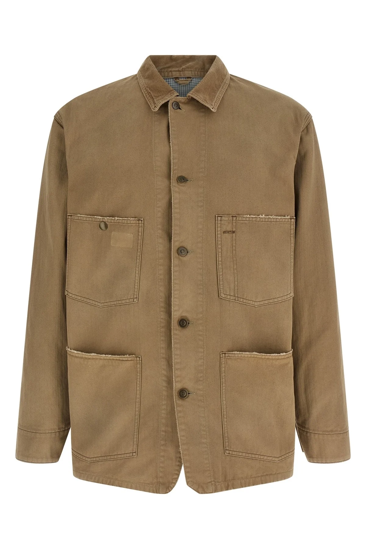 cod. S50AM0646M30024964 Used-effect herringbone cotton canvas jacket, check cotton lining, corduroy collar, front button closure, pockets, long sleeves with adjustable cuffs. Color: Beige Size & Fit: true to size fit Composition: 100% cotton Made in: Italy