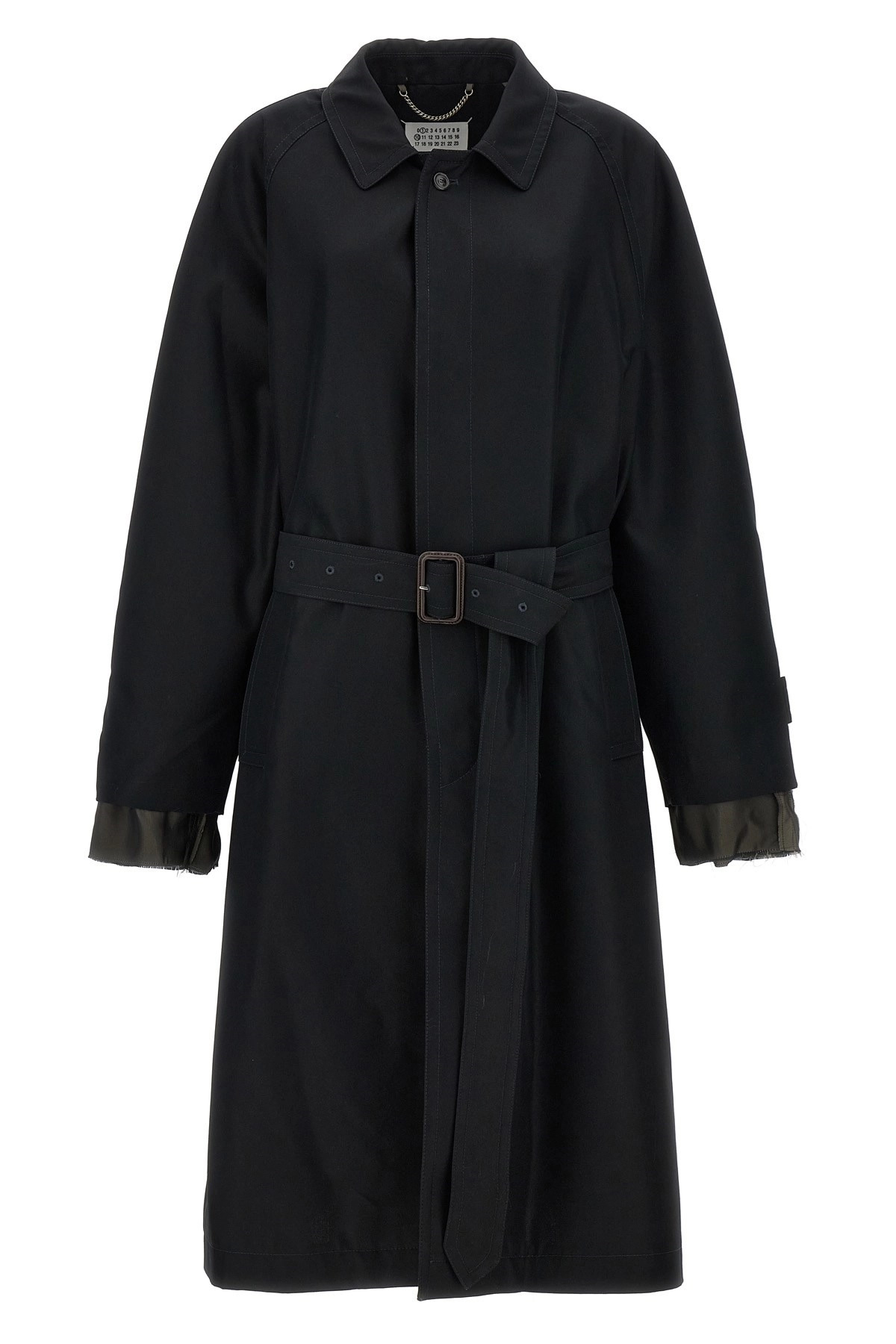 cod. S50AH0132S54694900 Long single-breasted cotton blend trench coat with button closure, belt at the waist, pockets, long sleeves with unfinished visible lining, and back split. Color: Black Size & Fit: true to size fit Composition: 65% cotton, 35% polyester Made in: Italy