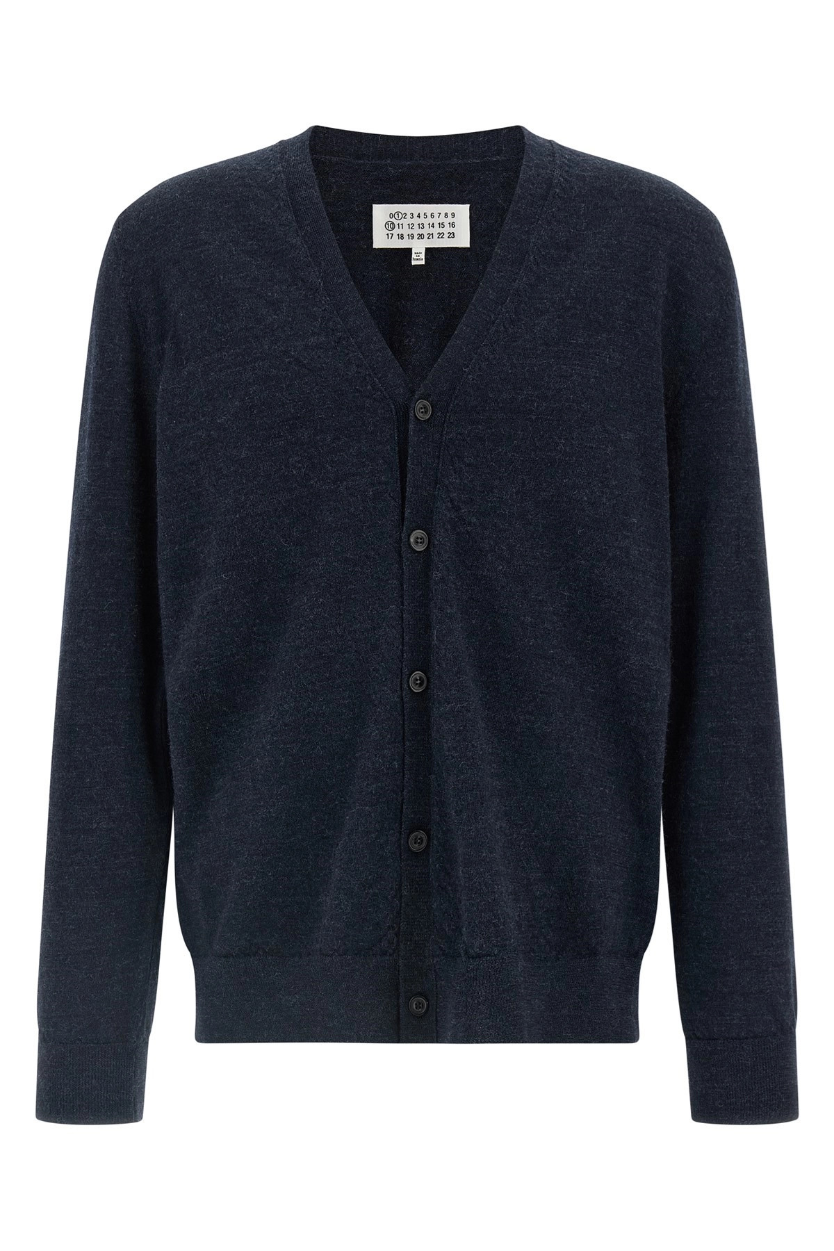 cod. S50HP0027M13098511M Wool cardigan, V-neck, front button closure, long cuffed sleeves, suede elbow patch, 'Four stitches' at the back. Color: Blue Size & Fit: Comfort fit Composition: 100% wool Made in: Romania