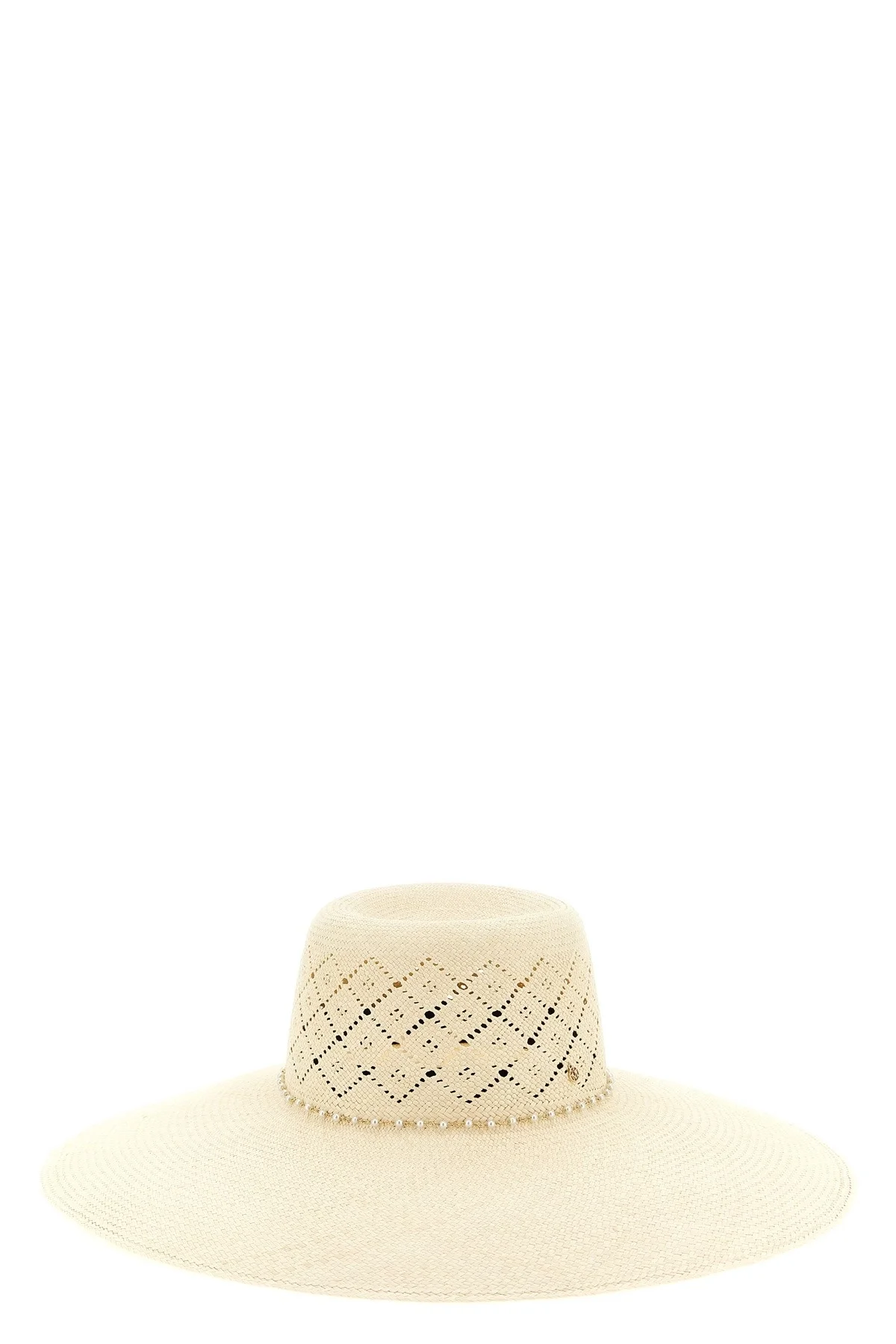 cod. 1004087001NATURAL 'Blanche' hat in natural Panama straw, wide-brimmed caplin style with openwork embroidery and pearl chain. Handcrafted product, any imperfections are to be considered characteristics of uniqueness. Color: Beige Size & Fit: true to size fit S: 56 cm M: 58 cm W: 60 cm Composition: 100% brisa Made in: Ecuador