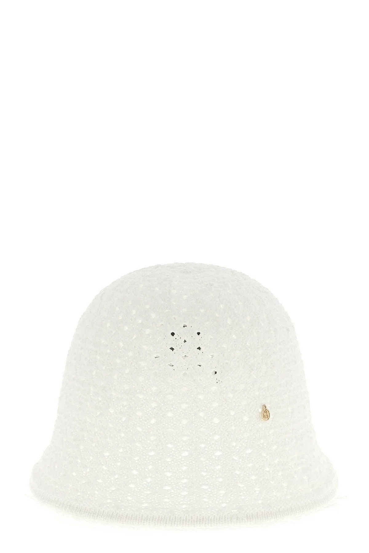 cod. 2628002001WHITE 'Lison' knitted cotton hat, cloche pattern, micro metal logo applique, fringed hem. Color: White Size & Fit: true to size fit S: 56 cm M: 58 cm W: 60 cm Composition: 50% cotton 50% polyamide Made in: Italy