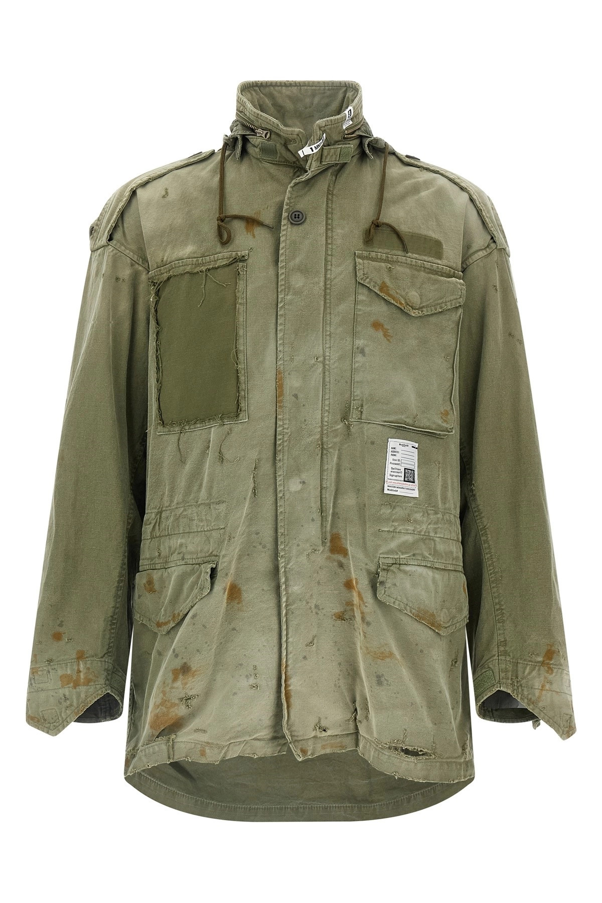 cod. J15BL171KHAKI 'Distressed Field' jacket in aged, stained and worn cotton, high neck with removable adjustable hood, trompe l'oeil details, front zip and snap button closure, logo patch, drawstring at the waist, curved moon sleeve with dropped shoulder and asymmetrical cuffs, asymmetrical hem. Color: Green Size & Fit: oversized fit Composition: 100% cotton Made in: Japan