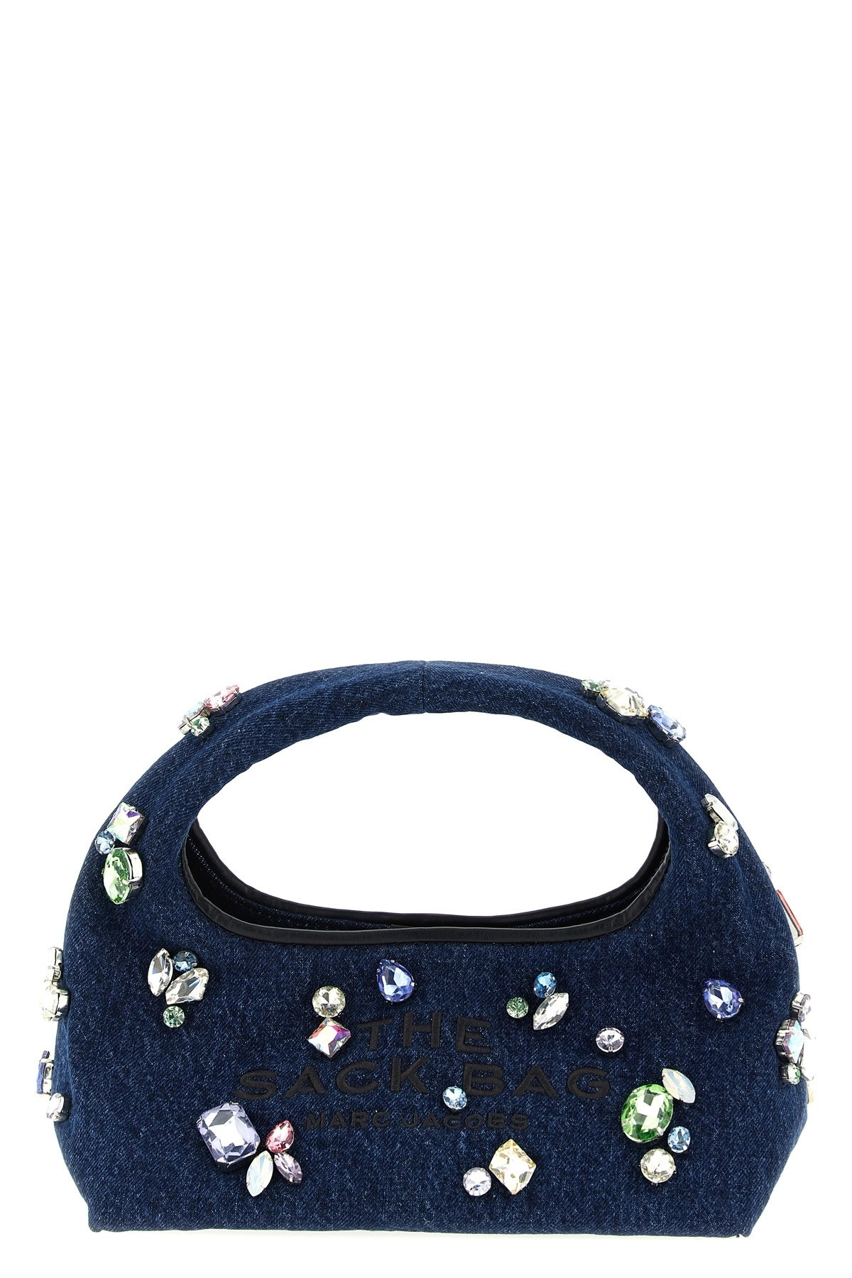 cod. 2P5HSC051H03495 'The Gem Denim Mini Sack' cotton denim handbag with crystal applique, front logo embroidery, fixed handle, magnetic closure, removable clutch. Color: Blue Size & Fit: W 24 x H 14 x D 13 cm Composition: 98% cotton, 2% polyester Made in: Vietnam