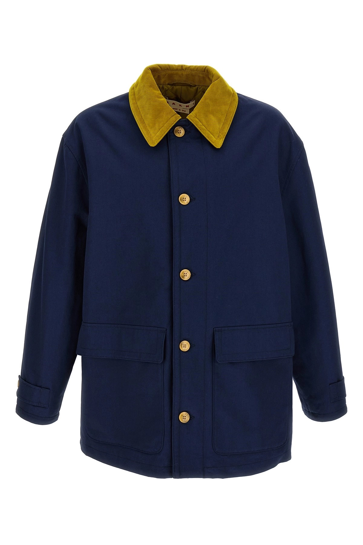 cod. TUMU0127QXUTC31100B80 Lightly padded cotton gabardine parka, quilted lining, back silicone logo, contrast corduroy collar, front button closure, pockets, long sleeves with cuffs and dropped shoulder. SUSTAINABLE: This product is made of organic cotton. Color: Blue Size & Fit: Relaxed fit Composition: 100% cotton Made in: Italy