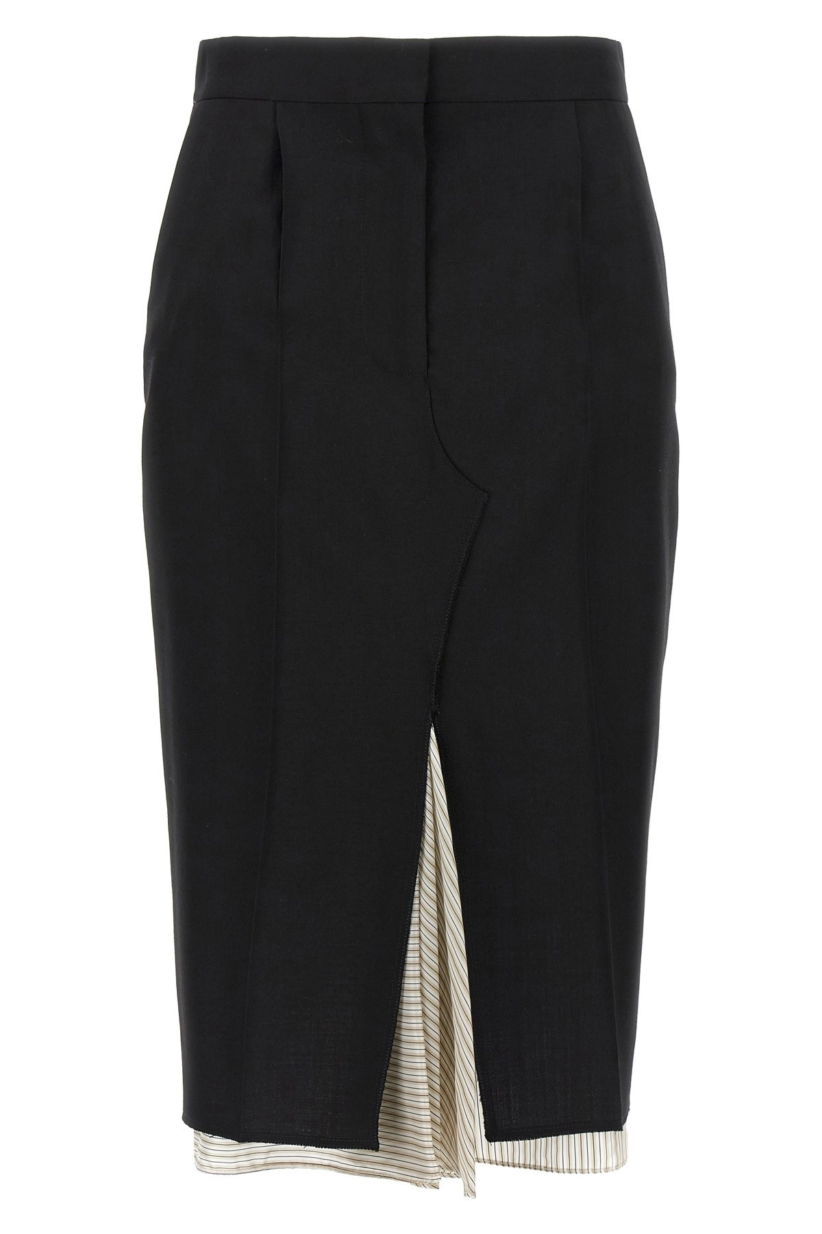 cod. GOMA0767U0TW83900N99 Cool wool midi skirt, exposed striped cupro lining, tailored style with straight line with pleat and stretched pleat, central raw cut split on the front and back, hook and front button zip closure, pockets, asymmetric hem. Color: Black Size & Fit: true to size fit Composition: 100% virgin wool Made in: Italy