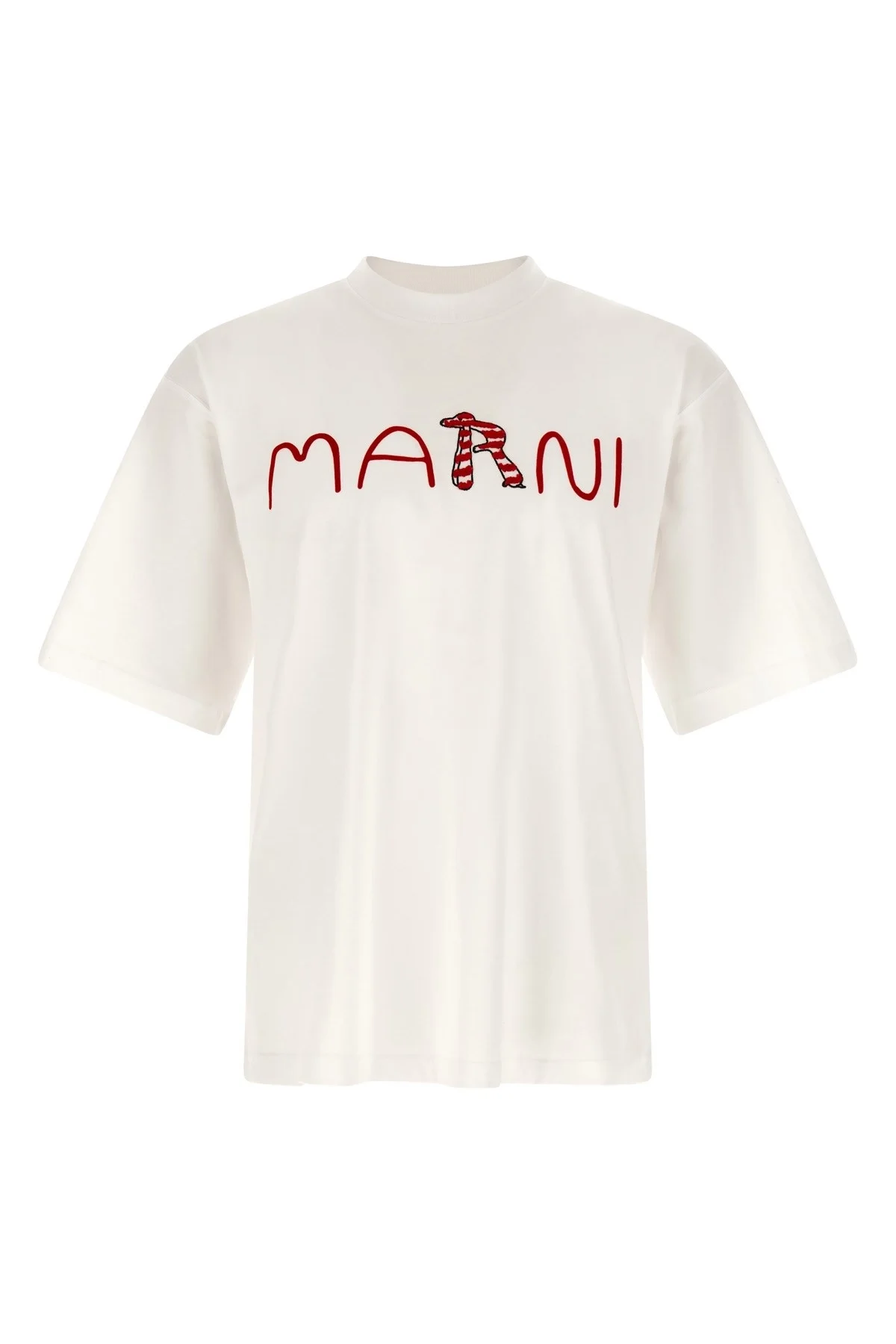 WHITE COTTON T-SHIRT WITH FLOCKED MARNI ANIMAL ALPHABET LOGO