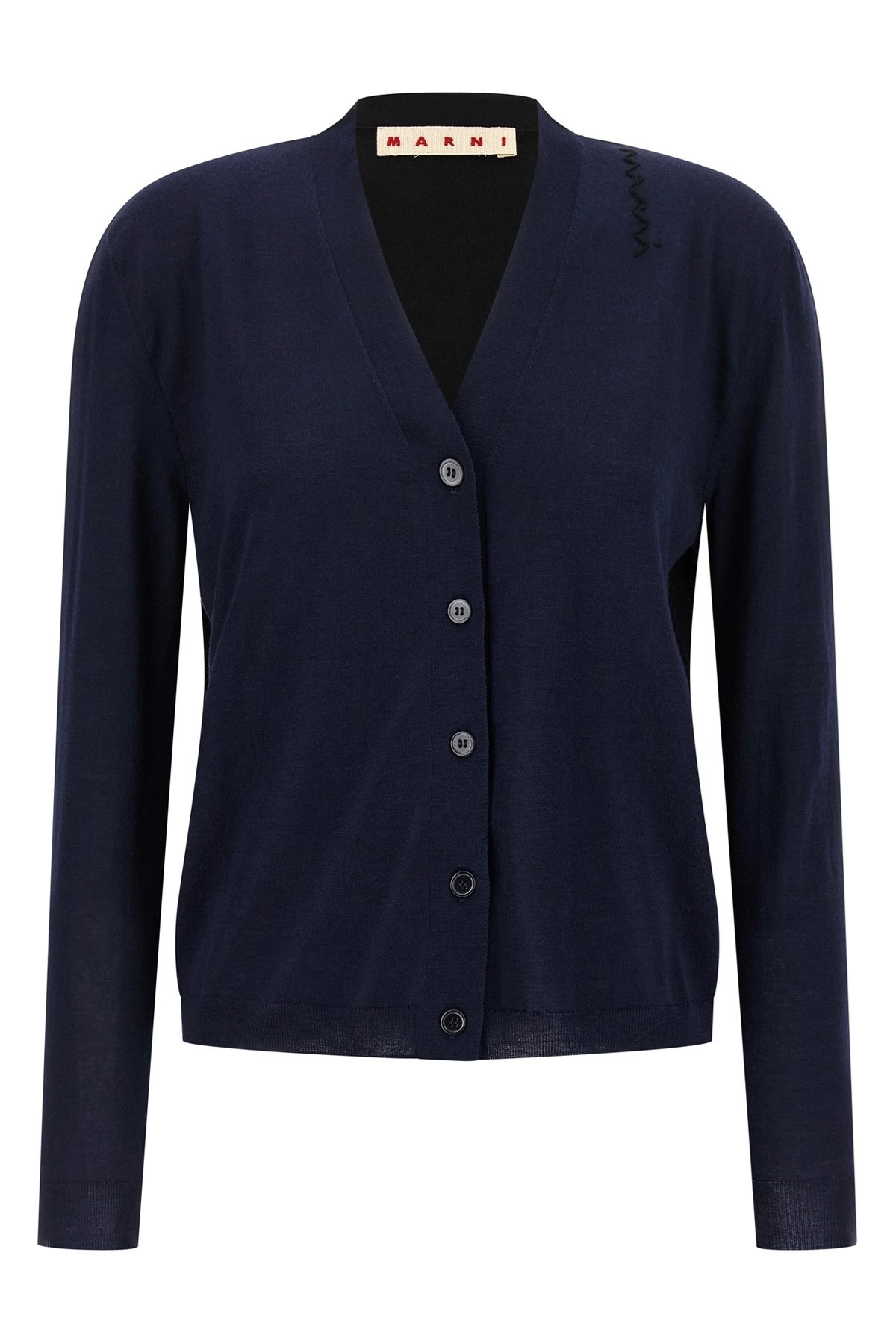 cod. CDMD0390Q0UFZ628HAB61 Cardigan in two-tone wool and silk yarn, 'Marni Symbol' embroidery on the left shoulder, V-neck, front button closure, long cuffed sleeves. Color: Multicolor Size & Fit: true to size fit Composition: 70% virgin wool 30% silk Made in: Romania