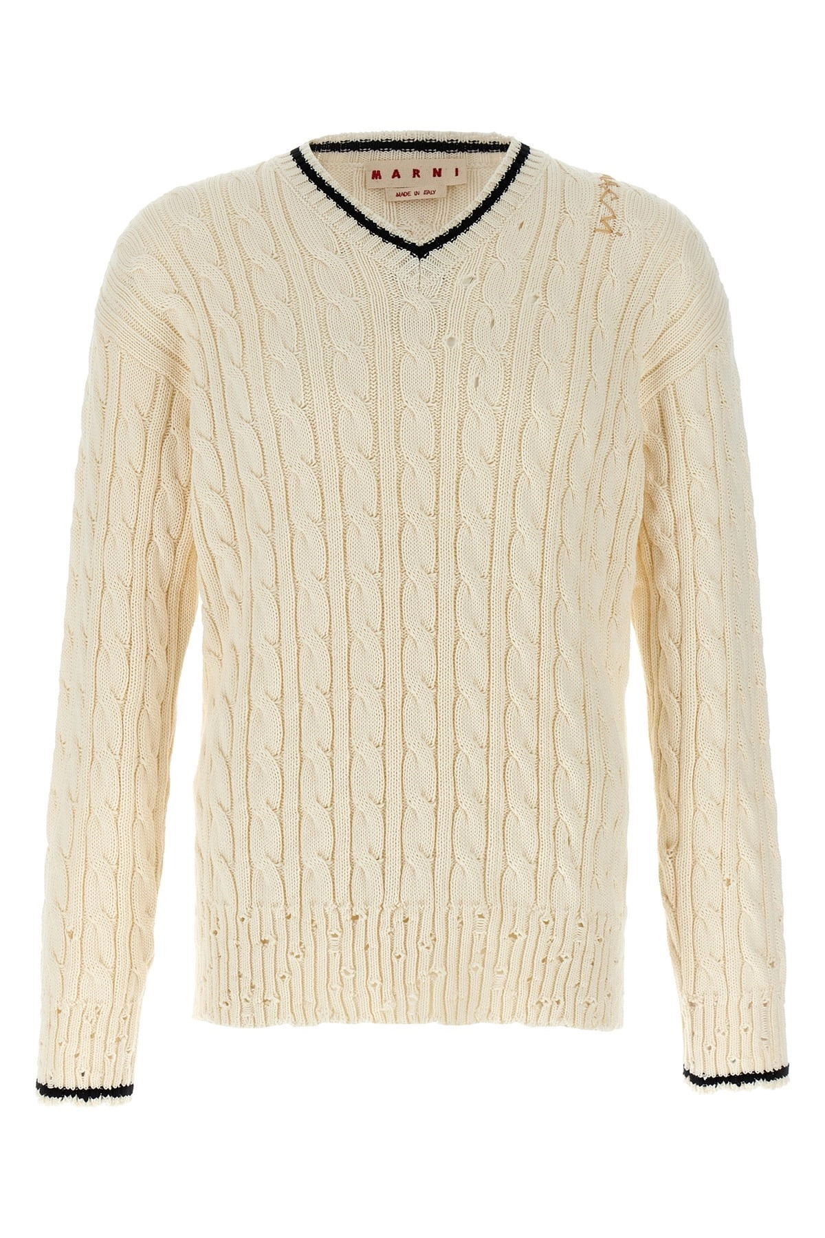 cod. CVMG0137Q0UFC65600W02 Cotton sweater with V neckline, slightly perforated braid, used-effect edges, logo embroidery detail, long cuffed sleeves. Color: White Size & Fit: True to size fit Composition: 100% cotton Made in: Italy