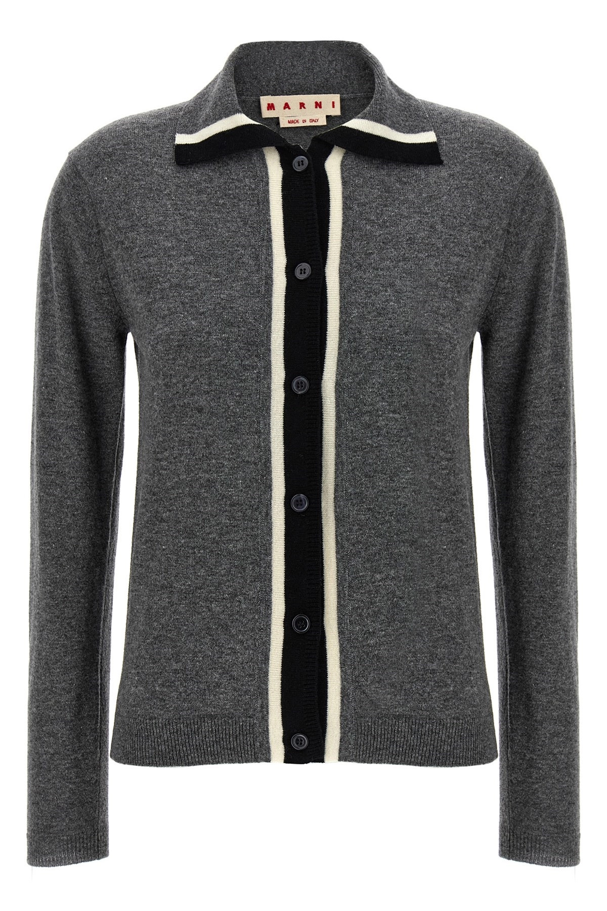 cod. CDMD0441Q0UFH55100N60 Virgin wool cardigan with contrasting details, collar, front button closure, long cuffed sleeves. Color: Gray Size & Fit: true to size fit Composition: 100% virgin wool Made in: Italy
